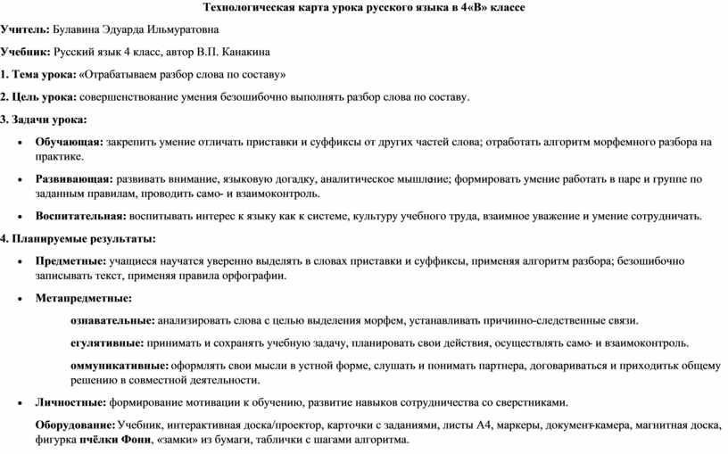 Технологическая карта урока русского языка в 4 «В» классе