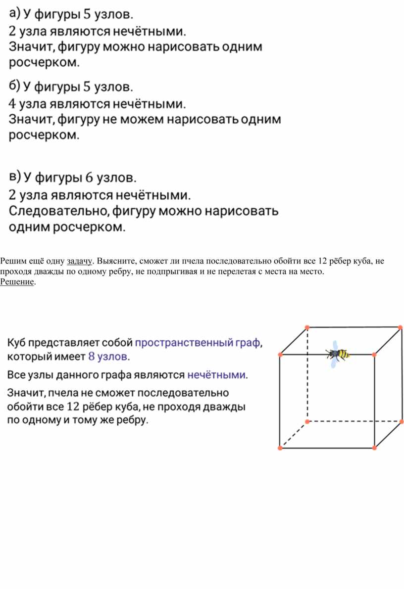 Решим ещё одну задачу. Выясните, сможет ли пчела последовательно обойти все 12 рёбер куба, не проходя дважды по одному ребру, не подпрыгивая и не перелетая с места на место.