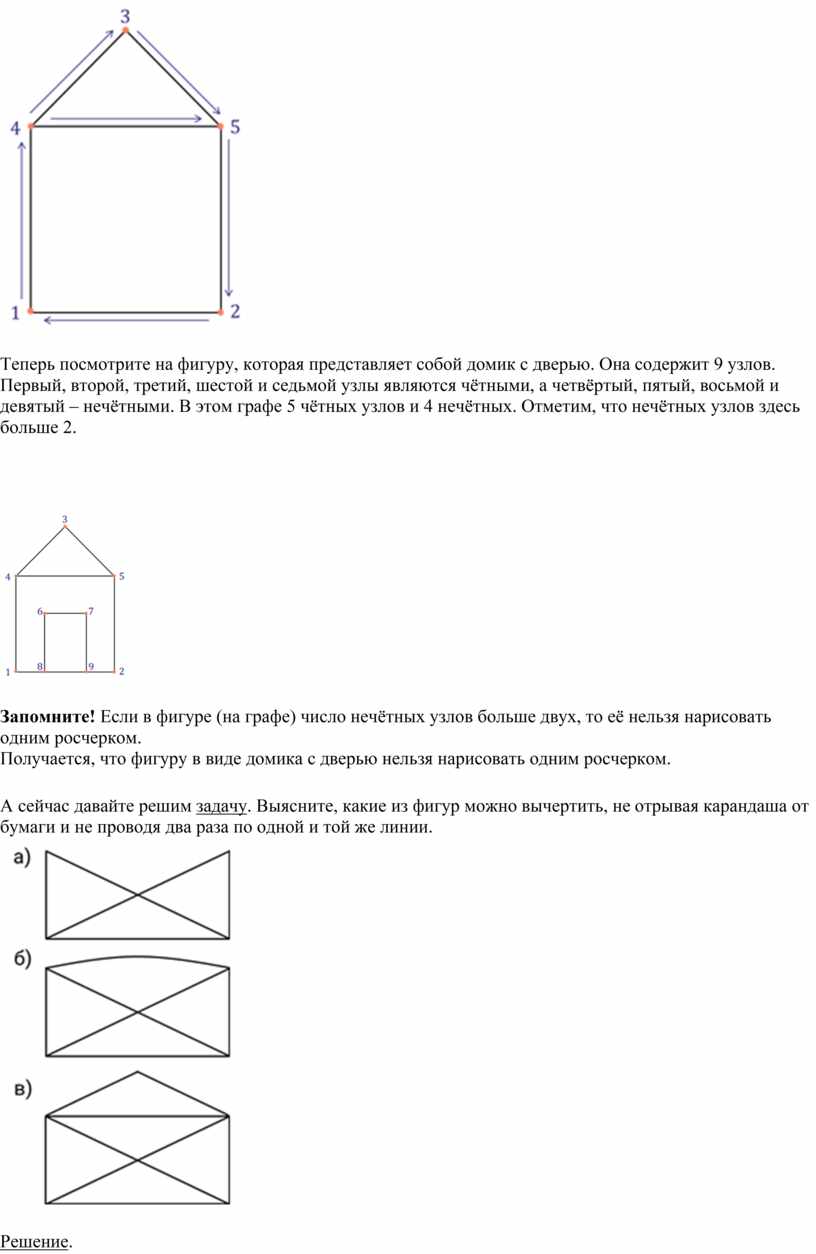 Теперь посмотрите на фигуру, которая представляет собой домик с дверью. Она содержит 9 узлов. Первый, второй, третий, шестой и седьмой узлы являются чётными, а четвёртый, пятый, восьмой и девятый – нечётными. В этом графе 5 чётных узлов и 4 нечётных. Отметим, что нечётных узлов здесь больше 2.