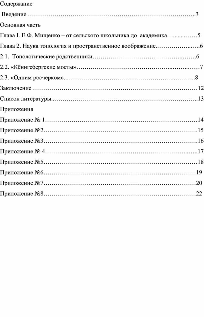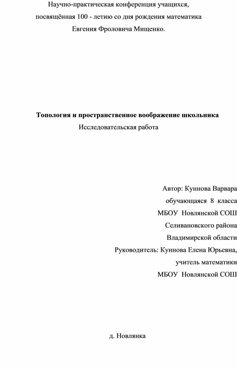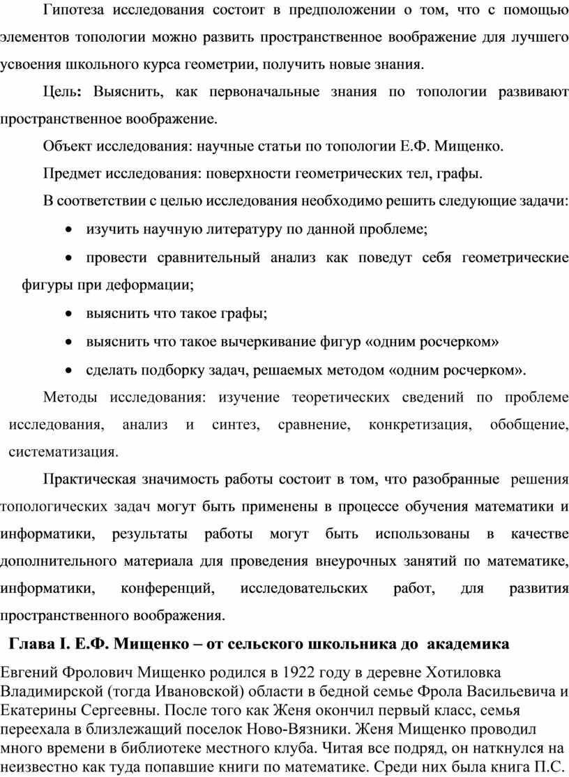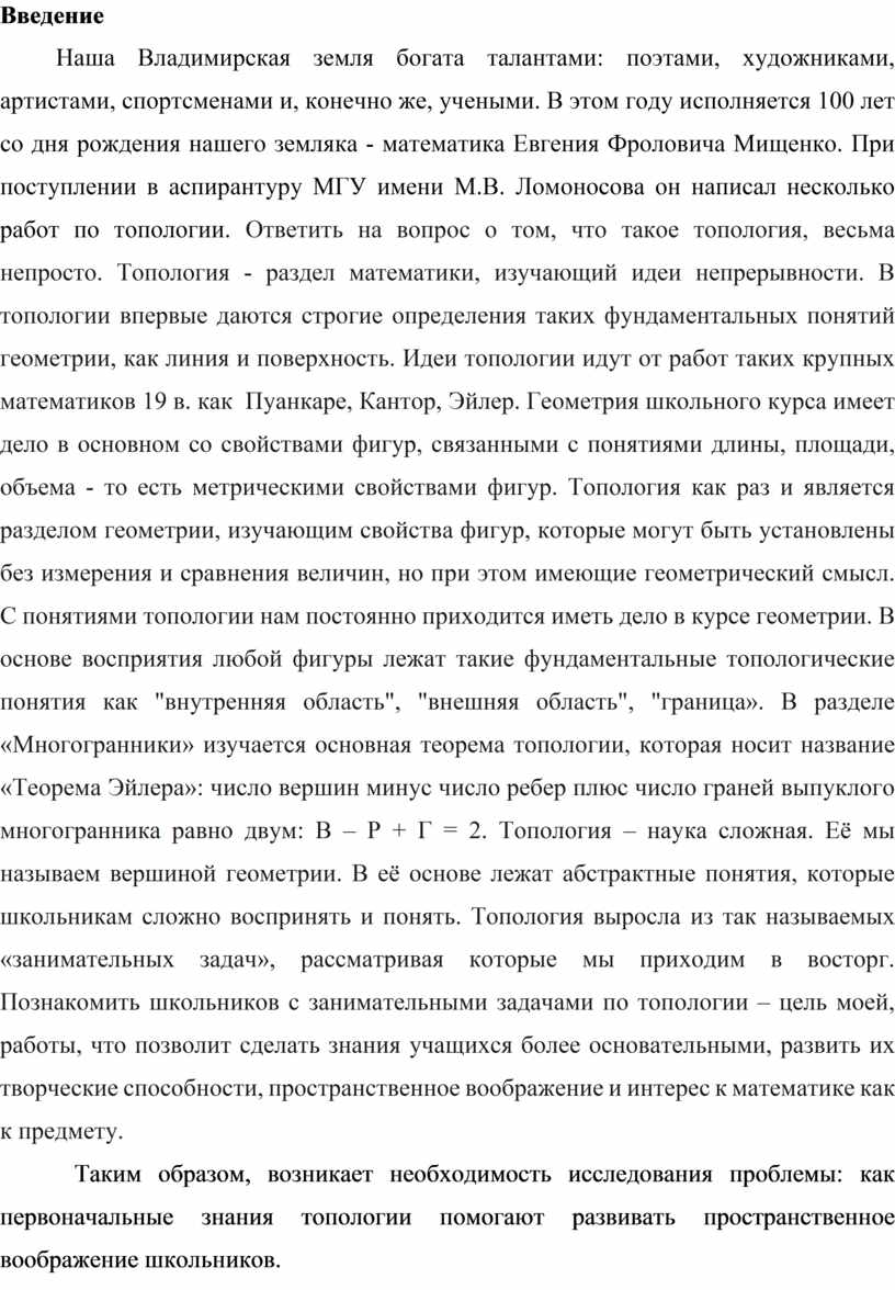 Наша Владимирская земля богата талантами: поэтами, художниками, артистами, спортсменами и, конечно же, учеными. В этом году исполняется 100 лет со дня рождения нашего земляка - математика Евгения Фроловича Мищенко. При поступлении в аспирантуру МГУ имени М.В. Ломоносова он написал несколько работ по топологии. Ответить на вопрос о том, что такое топология, весьма непросто. Топология - раздел математики, изучающий идеи непрерывности. В топологии впервые даются строгие определения таких фундаментальных понятий геометрии, как линия и поверхность. Идеи топологии идут от работ таких крупных математиков 19 в. как Пуанкаре, Кантор, Эйлер. Геометрия школьного курса имеет дело в основном со свойствами фигур, связанными с понятиями длины, площади, объема - то есть метрическими свойствами фигур. Топология как раз и является разделом геометрии, изучающим свойства фигур, которые могут быть установлены без измерения и сравнения величин, но при этом имеющие геометрический смысл. С понятиями топологии нам постоянно приходится иметь дело в курсе геометрии. В основе восприятия любой фигуры лежат такие фундаментальные топологические понятия как "внутренняя область", "внешняя область", "граница». В разделе «Многогранники» изучается основная теорема топологии, которая носит название «Теорема Эйлера»: число вершин минус число ребер плюс число граней выпуклого многогранника равно двум: В – Р + Г = 2. Топология – наука сложная. Её мы называем вершиной геометрии. В её основе лежат абстрактные понятия, которые школьникам сложно воспринять и понять. Топология выросла из так называемых «занимательных задач», рассматривая которые мы приходим в восторг. Познакомить школьников с занимательными задачами по топологии – цель моей, работы, что позволит сделать знания учащихся более основательными, развить их творческие способности, пространственное воображение и интерес к математике как к предмету.