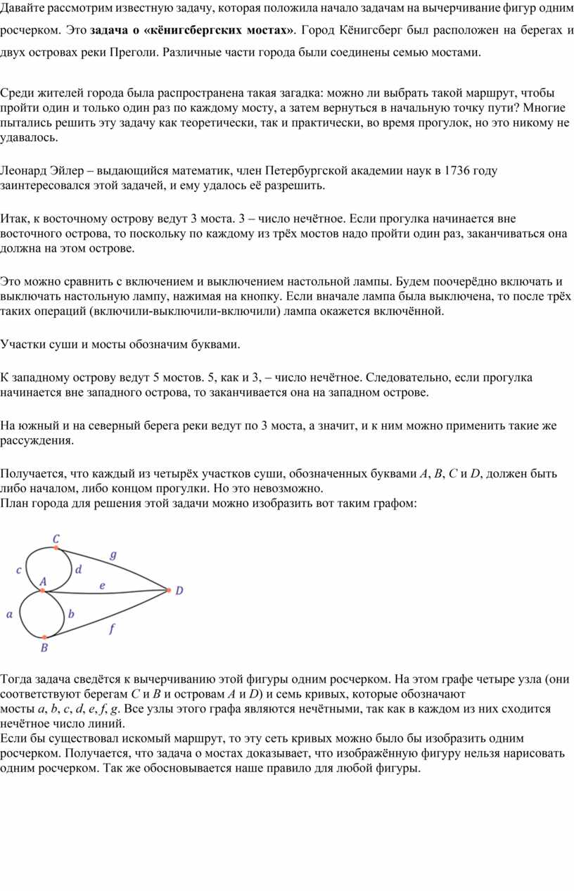 Если бы существовал искомый маршрут, то эту сеть кривых можно было бы изобразить одним росчерком. Получается, что задача о мостах доказывает, что изображённую фигуру нельзя нарисовать одним росчерком. Так же обосновывается наше правило для любой фигуры.