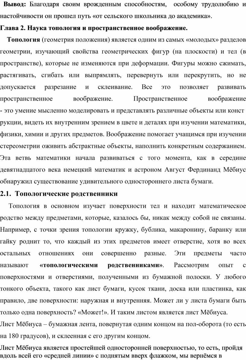 Топология (геометрия положения) является одним из самых «молодых» разделов геометрии, изучающий свойства геометрических фигур (на плоскости) и тел (в пространстве), которые не изменяются при деформации. Фигуры можно сжимать, растягивать, сгибать или выпрямлять, перевернуть или перекрутить, но не допускается разрезание и склеивание. Все это позволяет развивать пространственное воображение. Пространственное воображение - это умение мысленно моделировать и представлять различные объекты или конструкции, видеть их внутренним зрением в цвете и деталях при изучении математики, физики, химии и других предметов. Воображение помогает учащимся при изучении стереометрии оживить абстрактные объекты, наполнить конкретным содержанием. Эта ветвь математики начала развиваться с того момента, как в середине девятнадцатого века немецкий математик и астроном Август Фердинанд Мёбиус обнаружил существование удивительного одностороннего листа бумаги.