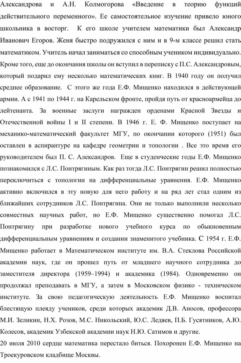Евгений Фролович Мищенко родился в 1922 году в деревне Хотиловка Владимирской (тогда Ивановской) области в бедной семье Фрола Васильевича и Екатерины Сергеевны. После того как Женя окончил первый класс, семья переехала в близлежащий поселок Ново-Вязники. Женя Мищенко проводил много времени в библиотеке местного клуба. Читая все подряд, он наткнулся на неизвестно как туда попавшие книги по математике. Среди них была книга П.С. Александрова и А.Н. Колмогорова «Введение в теорию функций действительного переменного». Ее самостоятельное изучение привело юного школьника в восторг. К его школе учителем математики был Александр Иванович Егоров. Женя быстро подружился с ним и в 9-м классе решил стать математиком. Учитель начал заниматься со способным учеником индивидуально. Кроме того, еще до окончания школы он вступил в переписку с П.С. Александровым, который подарил ему несколько математических книг. В 1940 году он получил среднее образование. С этого же года Е.Ф. Мищенко находился в действующей армии. А с 1941 по 1944 г. на Карельском фронте, пройдя путь от красноармейца до лейтенанта. За военные заслуги награжден орденами Красной Звезды и Отечественной войны I и II степени. В 1946 г. Е. Ф. Мищенко поступает на механико-математический факультет МГУ, по окончании которого (1951) был оставлен в аспирантуре на кафедре геометрии и топологии . Все это время его руководителем был П. С. Александров. Еще в студенческие годы Е.Ф. Мищенко познакомился с Л.С. Понтрягиным. Как раз тогда Л.С. Понтрягин решил полностью переключиться с топологии на дифференциальные уравнения. Е.Ф. Мищенко активно включился в эту новую для него работу и на ряд лет стал одним из ближайших сотрудников Л.С. Понтрягина. Они не только выполнили несколько совместных научных работ, но Е.Ф. Мищенко существенно помогал Л.С. Понтрягину при разработке нового учебного курса по обыкновенным дифференциальным уравнениям и создании знаменитого учебника. С 1954 г. Е.Ф. Мищенко работает в Математическом институте им. В.А. Стеклова Российской академии наук, где он прошел путь от младшего научного сотрудника до заместителя директора (1959–1994) и академика (1984). Одновременно он продолжал преподавать в МГУ, а затем в Московском физико - техническом институте. За свою педагогическую деятельность Е.Ф. Мищенко воспитал блестящую плеяду учеников, среди которых академик Д.В. Аносов, профессора М.И. Зеликин, Н.Х. Розов, М.С. Никольский, Ю.С. Ледяев, П.Б. Гусятников, А.Ю. Колесов, академик Узбекской академии наук Н.Ю. Сатимов и другие.