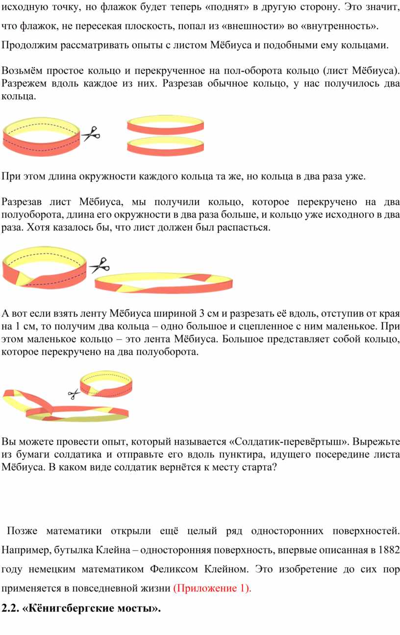 Разрезав лист Мёбиуса, мы получили кольцо, которое перекручено на два полуоборота, длина его окружности в два раза больше, и кольцо уже исходного в два раза. Хотя казалось бы, что лист должен был распасться.