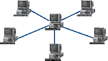 Звезда (star), при которой к одному центральному компьютеру присоединяются остальные периферийные компьютеры, причем каждый из них использует свою отдельную линию связи. Весь обмен информацией идет исключительно через