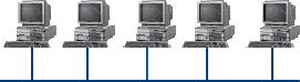 Шина (bus), при которой все компьютеры параллельно подключаются к одной линии связи, и информация от каждого компьютера одновременно передается ко всем остальным компьютерам. Согласно этой топологии создается одноранговая сеть. При таком соединении компьютеры могут передавать информацию только по очереди, так как линия связи единственная.