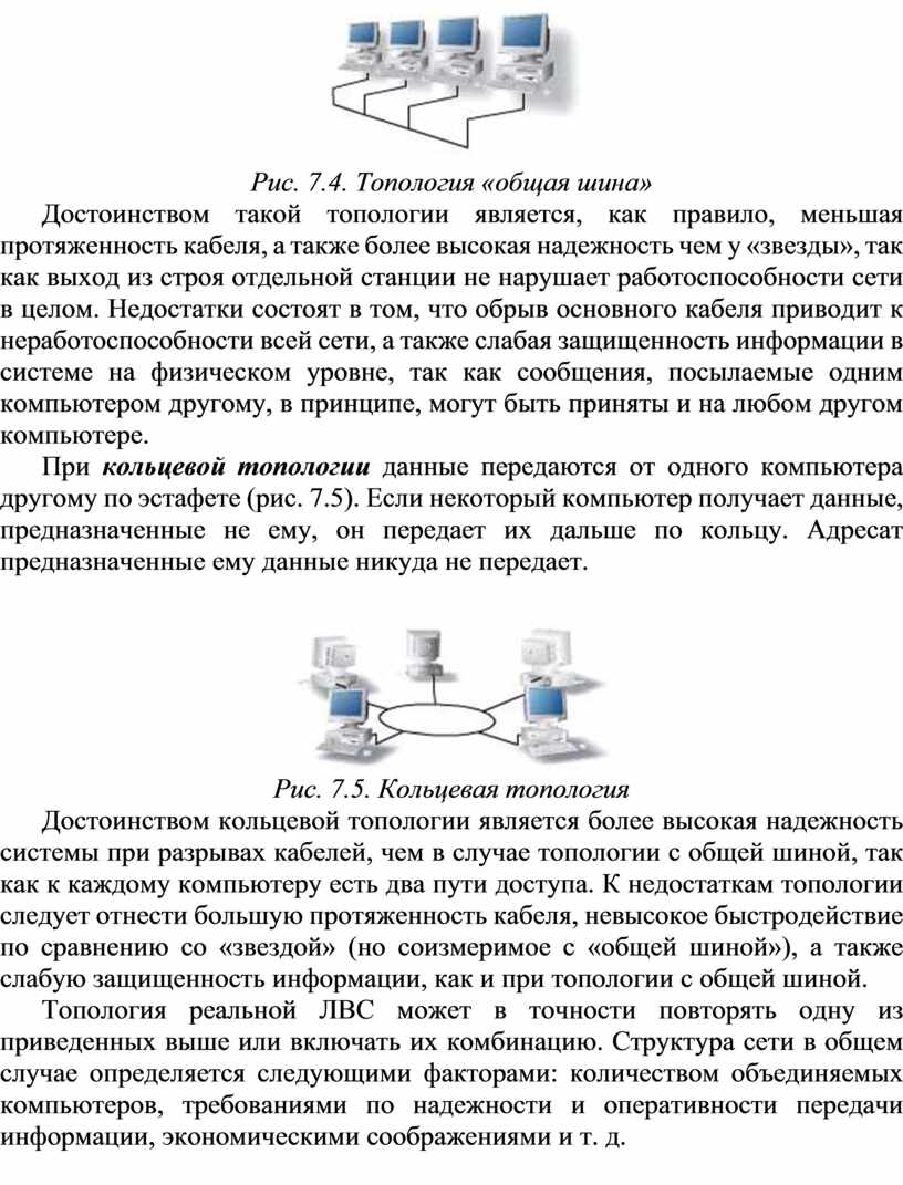 Топология реальной ЛВС может в точности повторять одну из приведенных выше или включать их комбинацию. Структура сети в общем случае определяется следующими факторами: количеством объединяемых компьютеров, требованиями по надежности и оперативности передачи информации, экономическими соображениями и т. д.