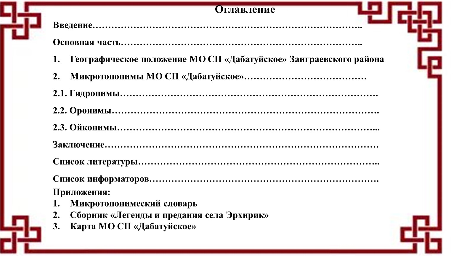 Микротопонимы МО СП «Дабатуйское»…………………………………