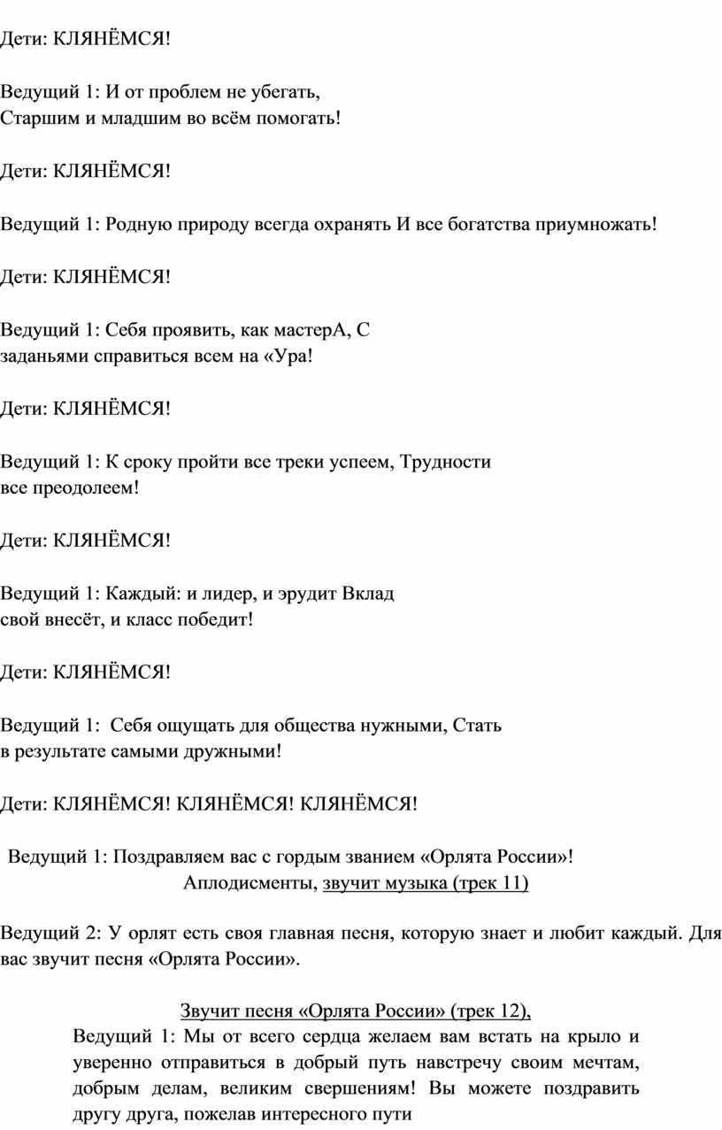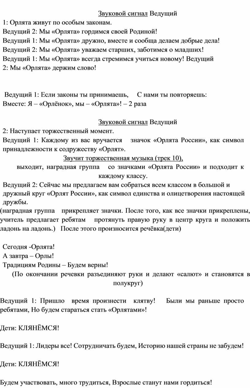 Ведущий 1: Пришло время произнести клятву! Были мы раньше просто ребятами, Но будем стараться стать «Орлятами»!