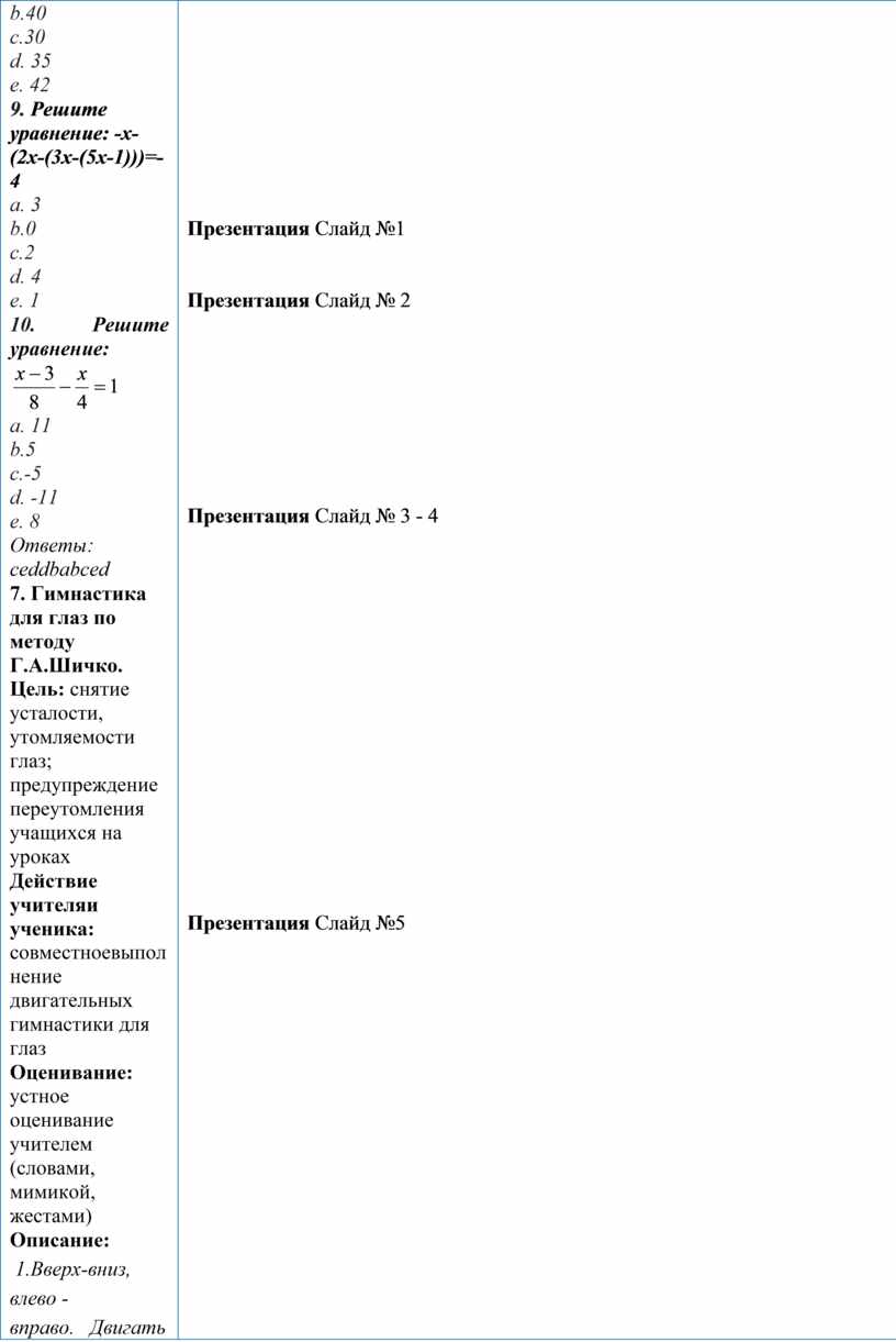 уравнение: l. a. 11 b.5 c.-5 d. -11 e. 8 Ответы: ceddbabced 7. Гимнастика для глаз по методу Г.А.Шичко. Цель: снятие усталости, утомляемости глаз; предупреждение переутомления учащихся на уроках Действие учителяи ученика: совместноевыполнение двигательных гимнастики для глаз Оценивание: устное оценивание учителем (словами, мимикой, жестами) Описание: 1.Вверх-вниз, влево - вправо. Двигать глазами вверх-вниз, влево - вправо. Зажмурившись снять напряжение, считая до десяти. 2.Круг. Представьте себе большой круг. Обводите его глазами сначала по часовой стрелке, потом против часовой стрелки. 3.Квадрат. Предложить детям представить себе квадрат. Переводить взгляд из правого верхнего угла в левый нижний - в левый верхний, в правый нижний. Еще раз одновременно посмотреть в углы воображаемого квадрата. 4.Покорчим «рожи». Учитель предлагает изображать мордочки различных животных или сказочных персонажей. |