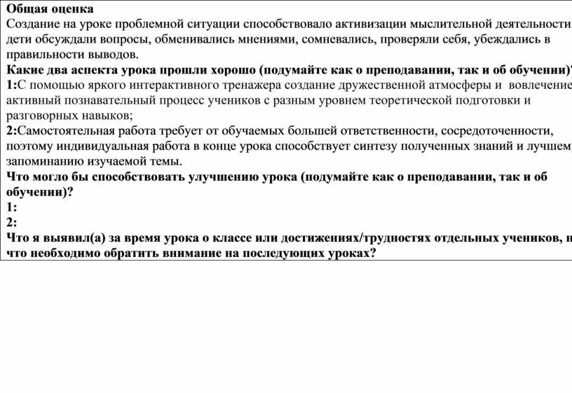 Общая оценка Создание на уроке проблемной ситуации способствовало активизации мыслительной деятельности, дети обсуждали вопросы, обменивались мнениями, сомневались, проверяли себя, убеждались в правильности выводов. Какие два аспекта урока прошли хорошо (подумайте как о преподавании, так и об обучении)? 1:С помощью яркого интерактивного тренажера создание дружественной атмосферы и вовлечение в активный познавательный процесс учеников с разным уровнем теоретической подготовки и разговорных навыков; 2:Самостоятельная работа требует от обучаемых большей ответственности, сосредоточенности, поэтому индивидуальная работа в конце урока способствует синтезу полученных знаний и лучшему запоминанию изучаемой темы. Что могло бы способствовать улучшению урока (подумайте как о преподавании, так и об обучении)? 1: 2: Что я выявил(а) за время урока о классе или достижениях/трудностях отдельных учеников, на что необходимо обратить внимание на последующих уроках? |