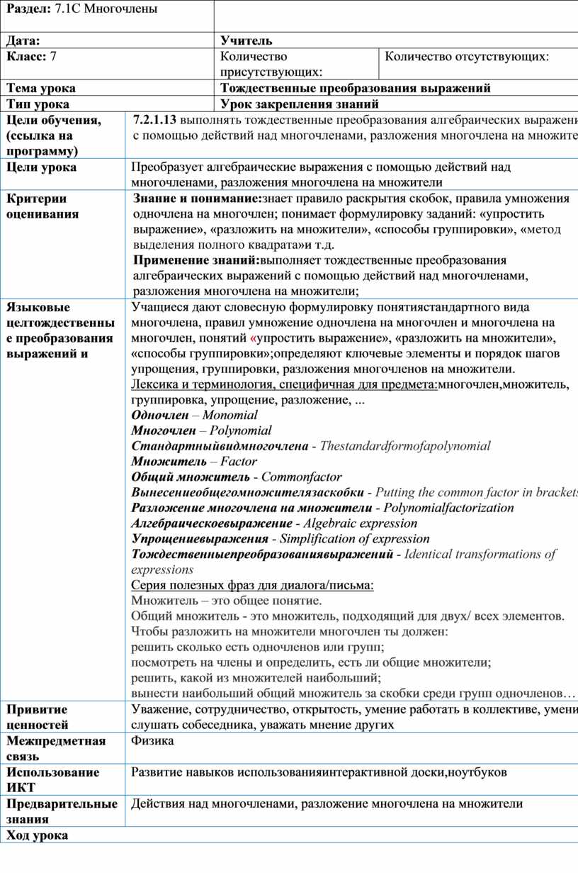 Цели были реализованы, ожидаемый результат подтвержден. Учащийся применяют тождественные преобразования алгебраических выражений с помощью действий над многочленами и разложение многочлена на множители. Атмосфера доброжелательная, рабочая. Во времени уложились. Изменения в план не вносились. Альтернативный материал не использован. |