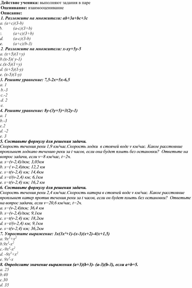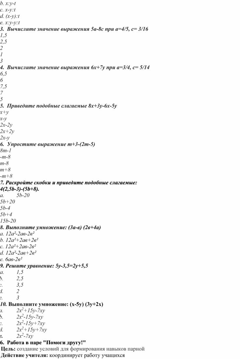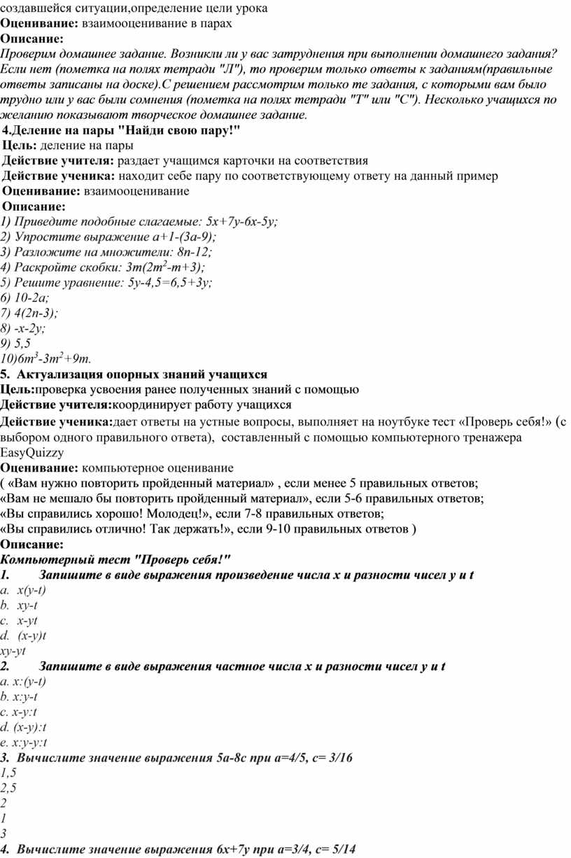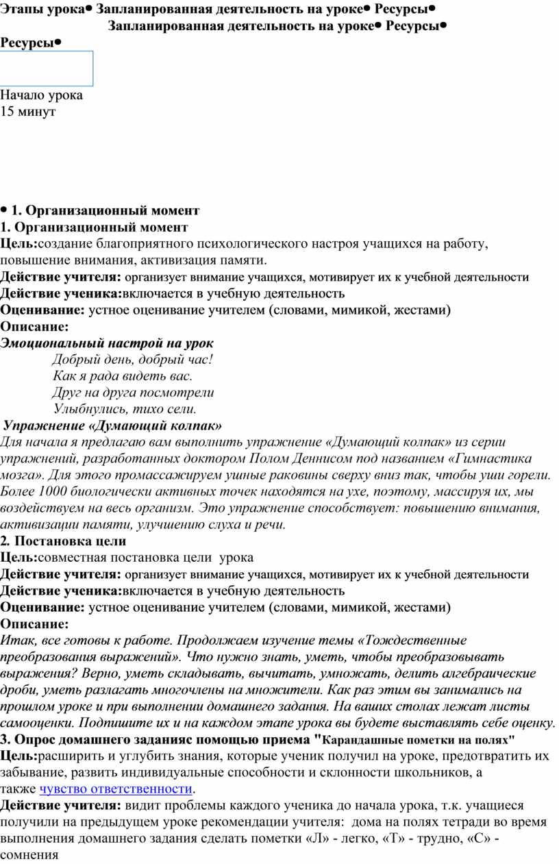1. Организационный момент Цель:создание благоприятного психологического настроя учащихся на работу, повышение внимания, активизация памяти. Действие учителя: организует внимание учащихся, мотивирует их к учебной деятельности Действие ученика:включается в учебную деятельность Оценивание: устное оценивание учителем (словами, мимикой, жестами) Описание: Эмоциональный настрой на урок Добрый день, добрый час! Упражнение «Думающий колпак» Для начала я предлагаю вам выполнить упражнение «Думающий колпак» из серии упражнений, разработанных доктором Полом Деннисом под названием «Гимнастика мозга». Для этого промассажируем ушные раковины сверху вниз так, чтобы уши горели. Более 1000 биологически активных точек находятся на ухе, поэтому, массируя их, мы воздействуем на весь организм. Это упражнение способствует: повышению внимания, активизации памяти, улучшению слуха и речи. 2. Постановка цели Цель:совместная постановка цели урока Действие учителя: организует внимание учащихся, мотивирует их к учебной деятельности Действие ученика:включается в учебную деятельность Оценивание: устное оценивание учителем (словами, мимикой, жестами) Описание: Итак, все готовы к работе. Продолжаем изучение темы «Тождественные преобразования выражений». Что нужно знать, уметь, чтобы преобразовывать выражения? Верно, уметь складывать, вычитать, умножать, делить алгебраические дроби, уметь разлагать многочлены на множители. Как раз этим вы занимались на прошлом уроке и при выполнении домашнего задания. На ваших столах лежат листы самооценки. Подпишите их и на каждом этапе урока вы будете выставлять себе оценку.3. Опрос домашнего заданияс помощью приема "Карандашные пометки на полях"Цель:расширить и углубить знания, которые ученик получил на уроке, предотвратить их забывание, развить индивидуальные способности и склонности школьников, а также чувство ответственности. Действие учителя: видит проблемы каждого ученика до начала урока, т.к. учащиеся получили на предыдущем уроке рекомендации учителя: дома на полях тетради во время выполнения домашнего задания сделать пометки «Л» - легко, «Т» - трудно, «С» - сомненияДействие ученика: знакомство с содержанием данной таблицы, осознание потребности построения нового способа действий, самостоятельное выявление места и причины затруднения в создавшейся ситуации,определение цели урокаОценивание: взаимооценивание в парах Описание: Проверим домашнее задание. Возникли ли у вас затруднения при выполнении домашнего задания? Если нет (пометка на полях тетради "Л"), то проверим только ответы к заданиям(правильные ответы записаны на доске).С решением рассмотрим только те задания, с которыми вам было трудно или у вас были сомнения (пометка на полях тетради "Т" или "С"). Несколько учащихся по желанию показывают творческое домашнее задание.4.Деление на пары "Найди свою пару!" Цель: деление на пары Действие учителя: раздает учащимся карточки на соответствия Действие ученика: находит себе пару по соответствующему ответу на данный пример Оценивание: взаимооценивание Описание: 1) Приведите подобные слагаемые: 5х+7у-6х-5у;2) Упростите выражение a+1-(3a-9);3) Разложите на множители: 8n-12;4) Раскройте скобки: 3m(2m2-m+3);5) Решите уравнение: 5у-4,5=6,5+3y; 6) 10-2a; 7) 4(2n-3); 8) -x-2y; 9) 5,5 10)6m3-3m2+9m. 5. Актуализация опорных знаний учащихсяЦель:проверка усвоения ран