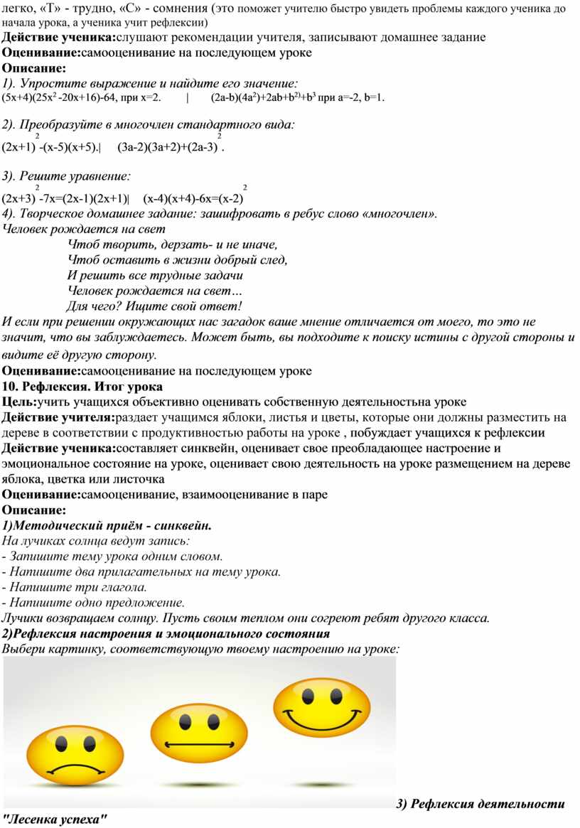 3). Решите уравнение: (2х+3)2-7х=(2х-1)(2х+1)| (x-4)(x+4)-6х=(х-2)2 4). Творческое домашнее задание: зашифровать в ребус слово «многочлен». Человек рождается на свет Чтоб творить, дерзать- и не иначе, Чтоб оставить в жизни добрый след, И решить все трудные задачи Человек рождается на свет… Для чего? Ищите свой ответ! И если при решении окружающих нас загадок ваше мнение отличается от моего, то это не значит, что вы заблуждаетесь. Может быть, вы подходите к поиску истины с другой стороны и видите её другую сторону. Оценивание:самооценивание на последующем уроке 10. Рефлексия. Итог урока Цель:учить учащихся объективно оценивать собственную деятельностьна уроке Действие учителя:раздает учащимся яблоки, листья и цветы, которые они должны разместить на дереве в соответствии с продуктивностью работы на уроке , побуждает учащихся к рефлексии Действие ученика:составляет синквейн, оценивает свое преобладающее настроение и эмоциональное состояние на уроке, оценивает свою деятельность на уроке размещением на дереве яблока, цветка или листочка Оценивание:самооценивание, взаимооценивание в паре Описание: 1)Методический приём - синквейн. На лучиках солнца ведут запись: Лучики возвращаем солнцу. Пусть своим теплом они согреют