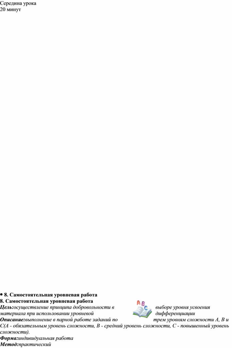 Цель:осуществление принципа добровольности в выборе уровня усвоения материала при использовании уровневой дифференциации Описание:выполнение в парной работе заданий по трем уровням сложности А, B и C(А - обязательным уровень сложности, B - средний уровень сложности, C - повышенный уровень сложности). Форма:индивидуальная работа Метод:практический Действие учителя:наблюдает за работой учащихся, направляет их работу Действие ученика:индивидуальная самостоятельная работа Оценивание:самооценивание по готовым ответам Вариант А 1. Упростите выражение: а) (2x-5)(3x+4); б) (x-3y)(2y-5x); в) a(a-5)-(a-2)(a-3). 2.Разложите на множители: а) ху+3у+ха+3а; б)2а-аb+6-3b; в) ab+2b+ac+2c; г)9-3y+3x-xy. 3. Решите уравнение: а)
