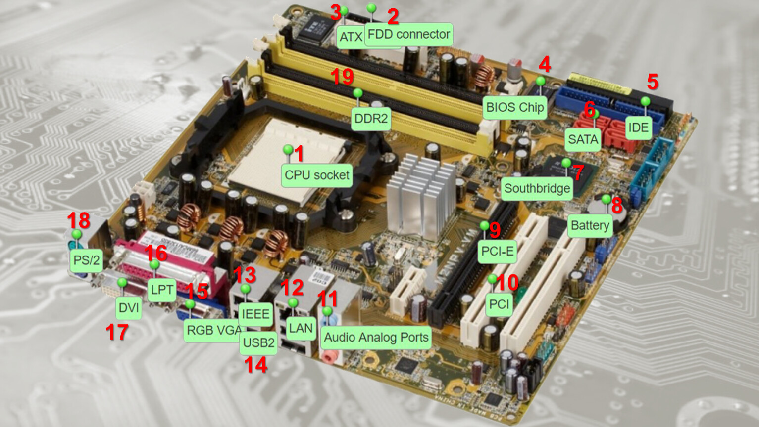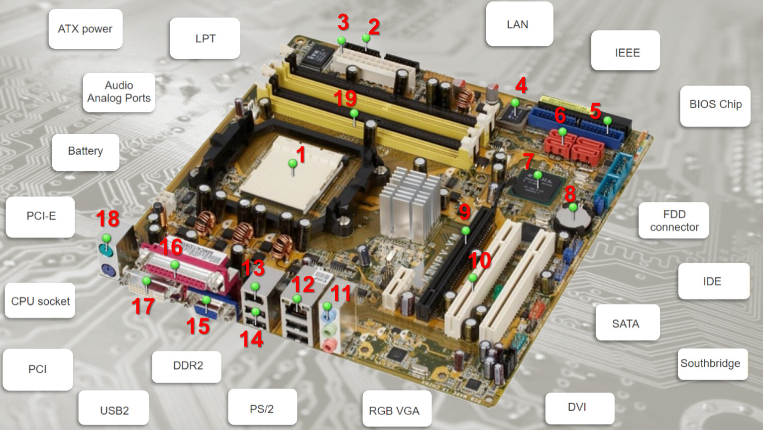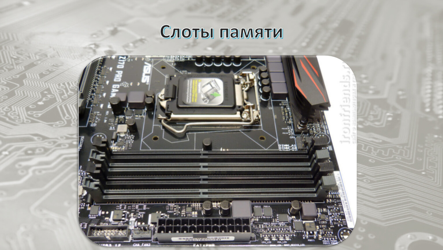 На ней находятся разъемы для подключения всех остальных деталей – видеокарты, оперативной памяти, процессора и др.