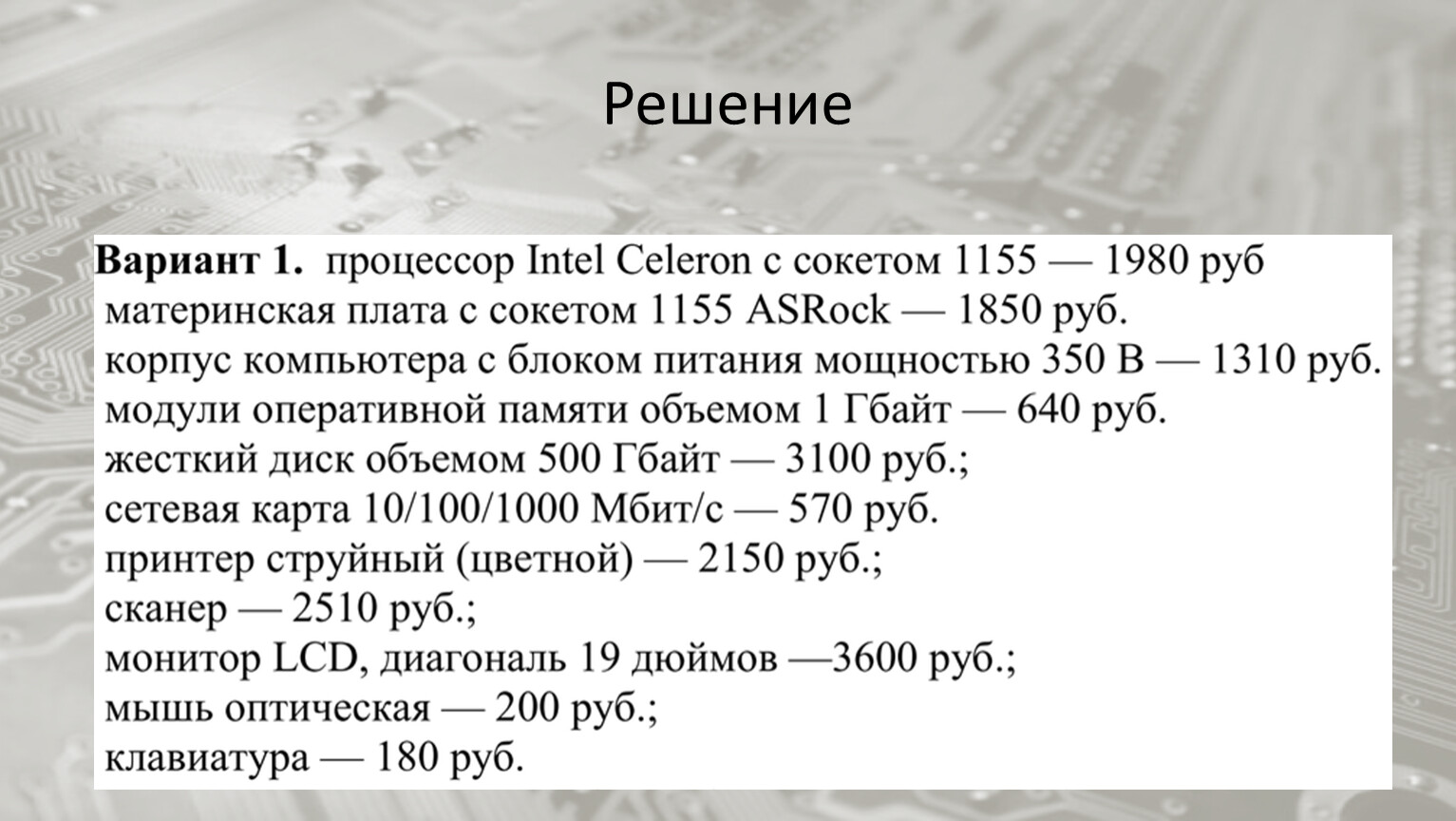 • процессор Socket-1155 Intel Celeron, 2,5 ГГц — 1980 руб.; • процессор Socket-1155 Intel Core i3-2100, 3,1 ГГц — 4390 руб.; • процессор Socket-1155 Intel Core i5-3450, 3,1 ГГц — 6740 руб.; • процессор Socket-АМЗ AMD ATHLON II ХЗ, 3,1 ГГц — 2510 руб.; • процессор Socket-АМЗ AMD Phenom II Х4, 3,5 ГГц — 5510 руб.; • материнская плата Socket-1155 ASRock DDR3 mATX AC’97+LAN+ VGA — 1850 руб.; • материнская плата Socket-1155 ASUSTeK 2xPCI-E+GbLAN SATA 2DDR-III — 2760 руб.; • материнская плата Socket-1155 GigaByte 2xPCI-E+GbLAN SATA — 4180 руб.; • материнская плата Socket-775 ASUSTeK PCI-E+SVGA+ GbLAN SATA 4DDR-III — 1770 руб.; • материнская плата Socket-АМЗ ASUSTeK PCI-E+GbLAN SATA 4DDR-III — 3300 руб.; • корпус компьютера с блоком питания мощностью 350 В — 1310 руб.; • корпус компьютера с блоком питания мощностью 400 В — 2480 руб.; • модули оперативной памяти объемом 1 Гбайт — 640 руб.; • модули оперативной памяти объемом 2 Гбайта — 850 руб.; • модули оперативной памяти объемом 4 Гбайта — 1330 руб.; • модули оперативной памяти объемом 8 Гбайт — 2010 руб.; • жесткий диск объемом 500 Гбайт — 3100 руб.; • жесткий диск объемом 1 Тбайт — 3570 руб.; • жесткий диск объемом 2 Тбайта — 4800 руб.;