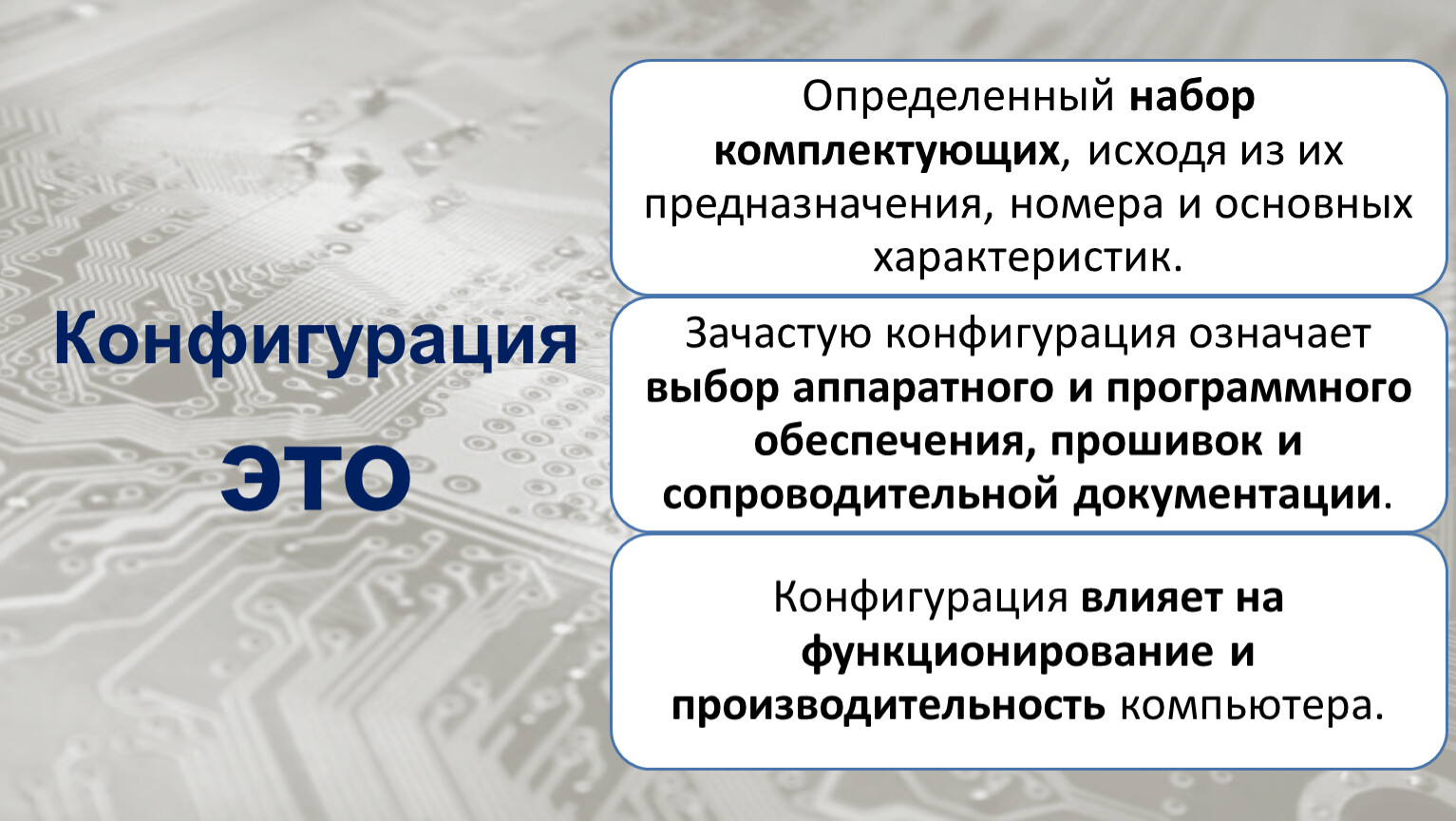 Базовая конфигурация ПК - минимальный комплект аппаратный средств, достаточный для начала работы с компьютером.