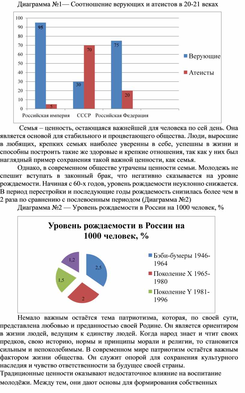 В нынешнее время важнейшую роль в формировании ценностей играет мораль и культура, хотя изначально люди опирались на православие и Библию, откуда была взята основа для формирования данных аспектов. Благодаря опоре на веру, люди старались сохранять традиционные ценности. С приходом к власти большевиков, начинается борьба с религией, массовое насаждение атеизма, которое подорвало нравственные религиозные ценности (Диаграмма №1), количество верующих людей сократилось почти в три раза. Однако, в середине 80-х годов роль церкви вновь возрастает, но вернуть ту степень важности религии пока не удалось. Семья играла важнейшую роль в жизни людей, патриотизм не был просто словом, огромный вес играл гуманизм и альтруизм. Однако, в современном мире – мире технологий и информации, традиционные ценности подвергаются испытанию, что может привести к рассеиванию устоявшихся норм и принципов. Одной из важных задач современности стоит сохранение и адаптация ценностей в условиях меняющегося мира.