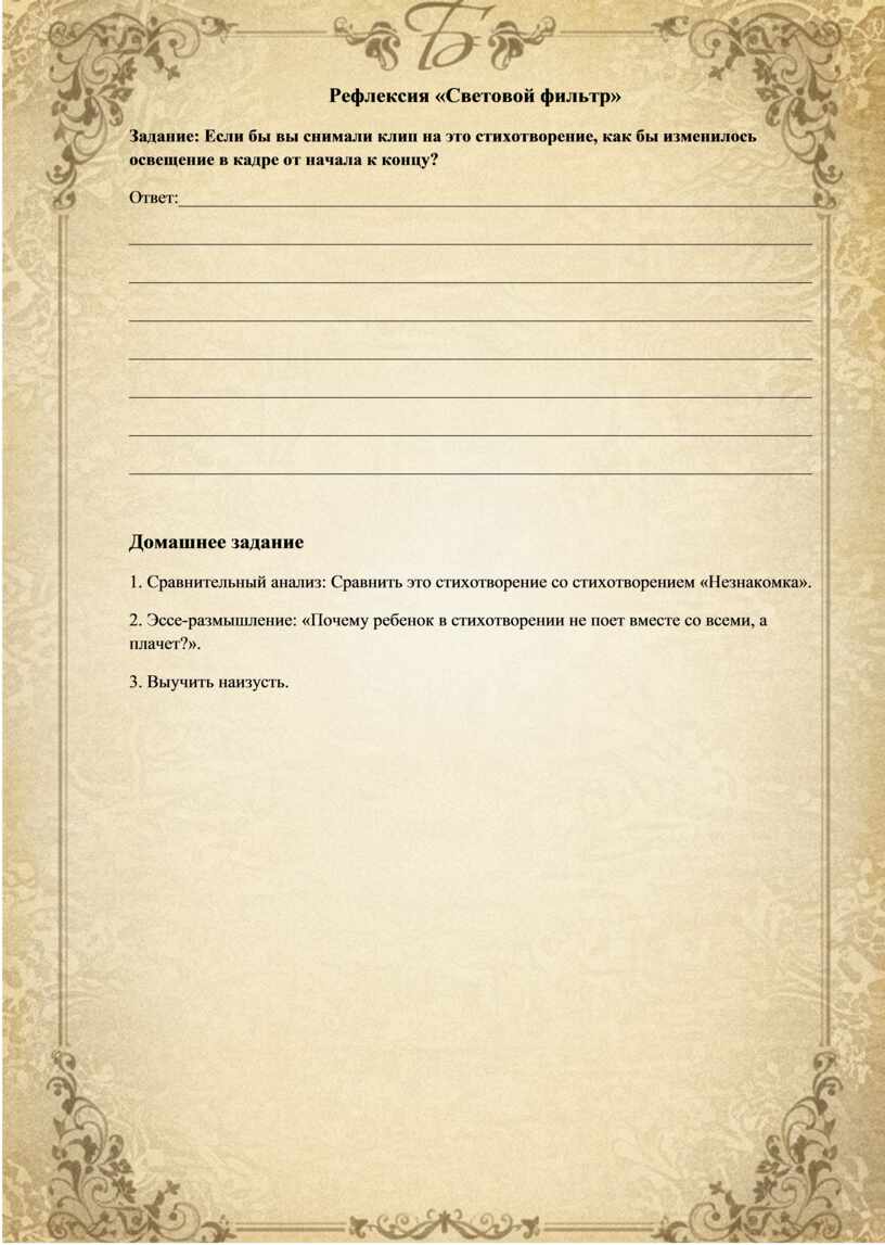Задание: Если бы вы снимали клип на это стихотворение, как бы изменилось освещение в кадре от начала к концу?