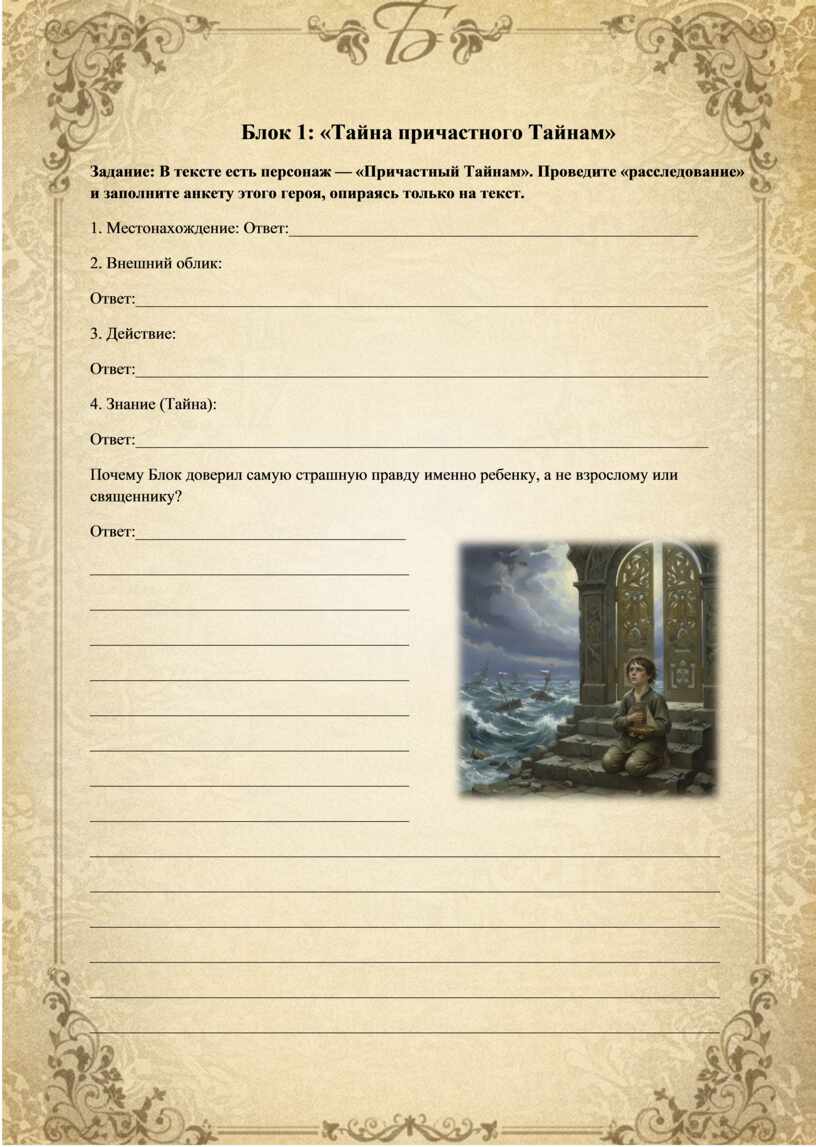 Задание: В тексте есть персонаж — «Причастный Тайнам». Проведите «расследование» и заполните анкету этого героя, опираясь только на текст.