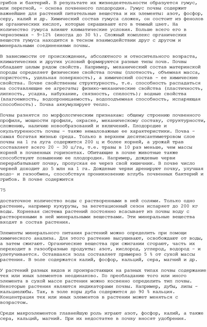 Почва - рыхлый поверхностный слой земной коры, обладающий плодородием, это особое природное тело и среда жизни для многих организмов, т.е. это важный и сложный компонент биосферы, тесно связанный с другими ее частями. Почвы возникают в результате выветривания и почвообразования. Выветривание - процесс разрушения поверхностных горных пород. Различают физическое, химическое и биологическое выветривание. В почвообразовании преобладает биологический фактор - взаимодействие растений, животных, грибов и бактерий. В результате их жизнедеятельности образуется гумус, или перегной, - основа почвенного плодородия. Гумус почвы содержит важнейшие для растений питательные вещества и их элементы: азот, фосфор, серу, калий и др. Химический состав гумуса сложен, он состоит из фенолов и органических кислот, которые окрашивают его в темный цвет. На количество гумуса влияют климатические условия. Больше всего его в черноземах - 9-12% (иногда до 30 %). Сложный комплекс органических веществ гумуса находится в тесном взаимодействии друг с другом и минеральными соединениями почвы.