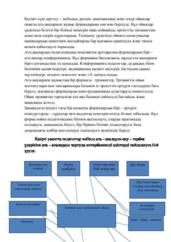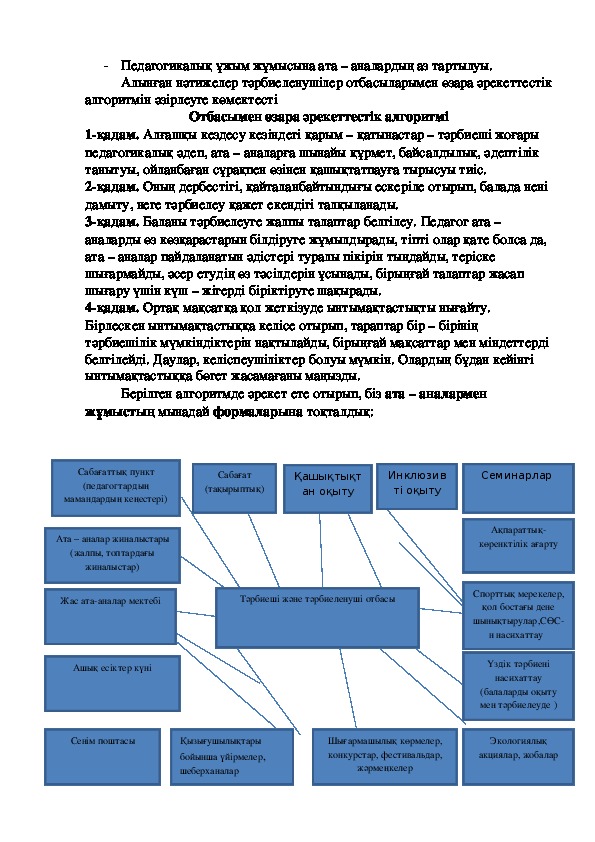 көптеген формалары қалыптасып, өз жемісін беруде. Педагог ата – анамен