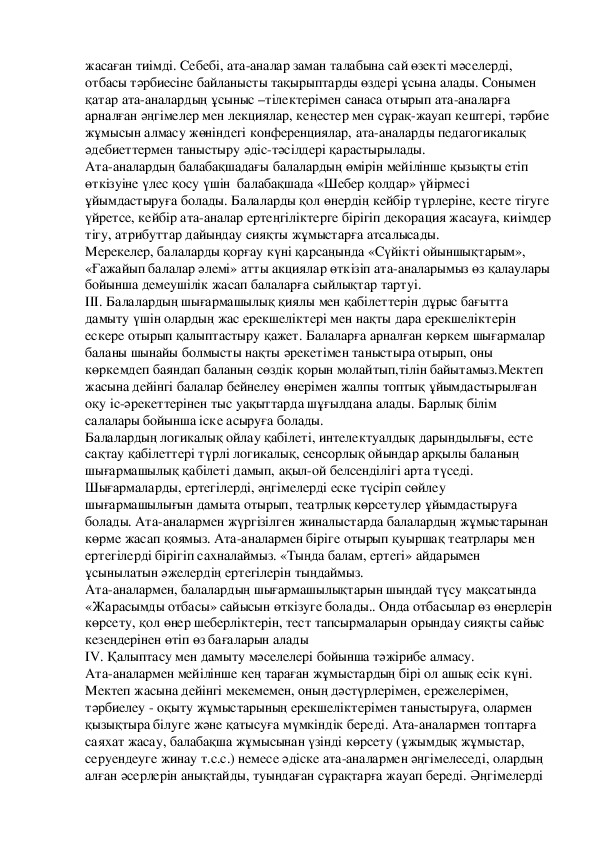 жұмысы. Бұндай жиындарда ата – аналар балабақшадағы белгілі бір жастобындағы және отбасындағы тәрбиенің мақсаты және міндеттерімен, түрлері