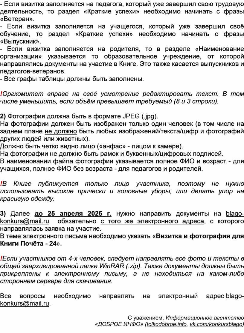 Напоминаем, что участникам необходимо подготовить два материала: текстовую визитку и фотографию - до 25 апреля 2025 г. (включительно).