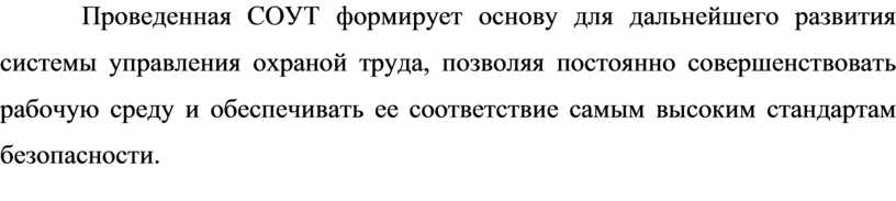 Проведенная СОУТ формирует основу для дальнейшего развития системы управления охраной труда, позволяя постоянно совершенствовать рабочую среду и обеспечивать ее соответствие самым высоким стандартам безопасности.