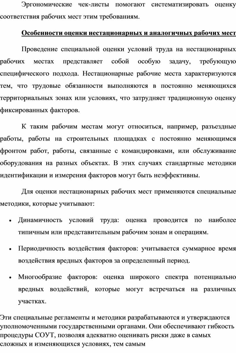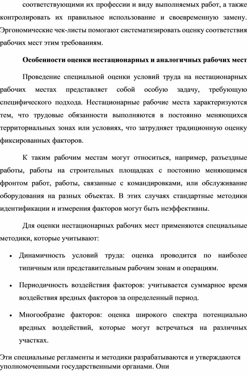 Для оценки нестационарных рабочих мест применяются специальные методики, которые учитывают: