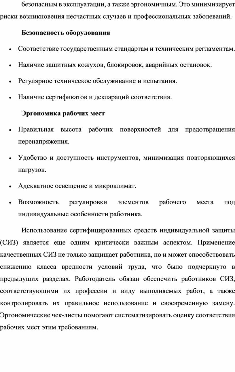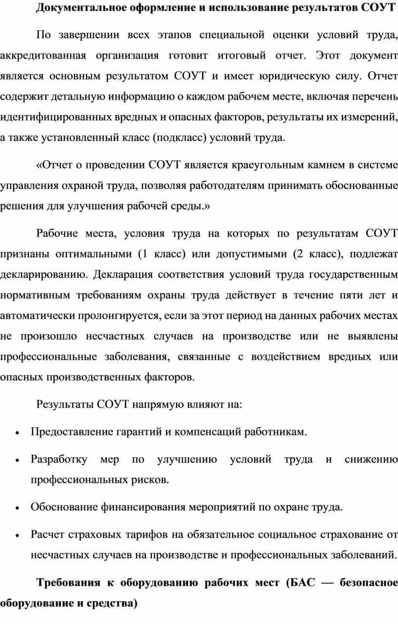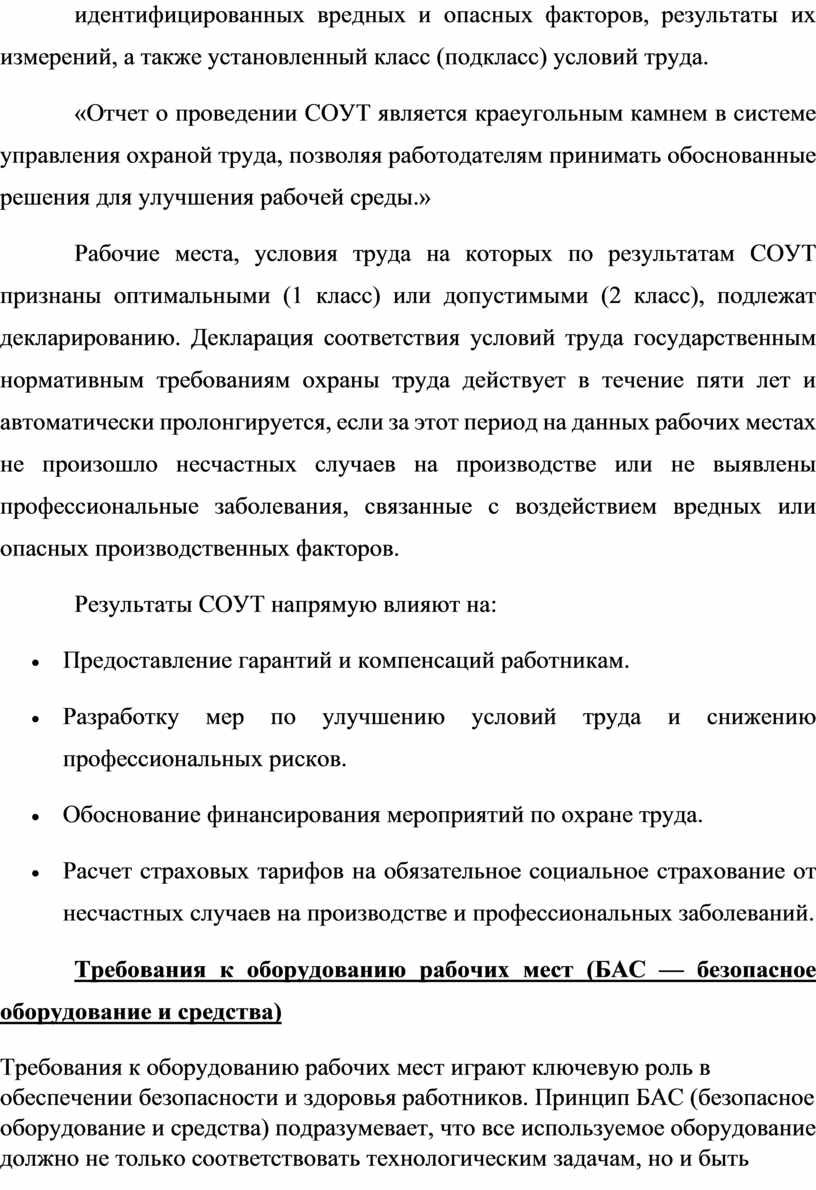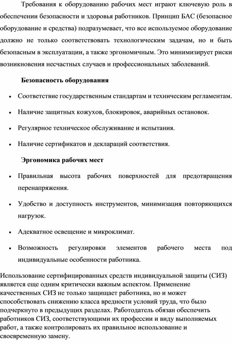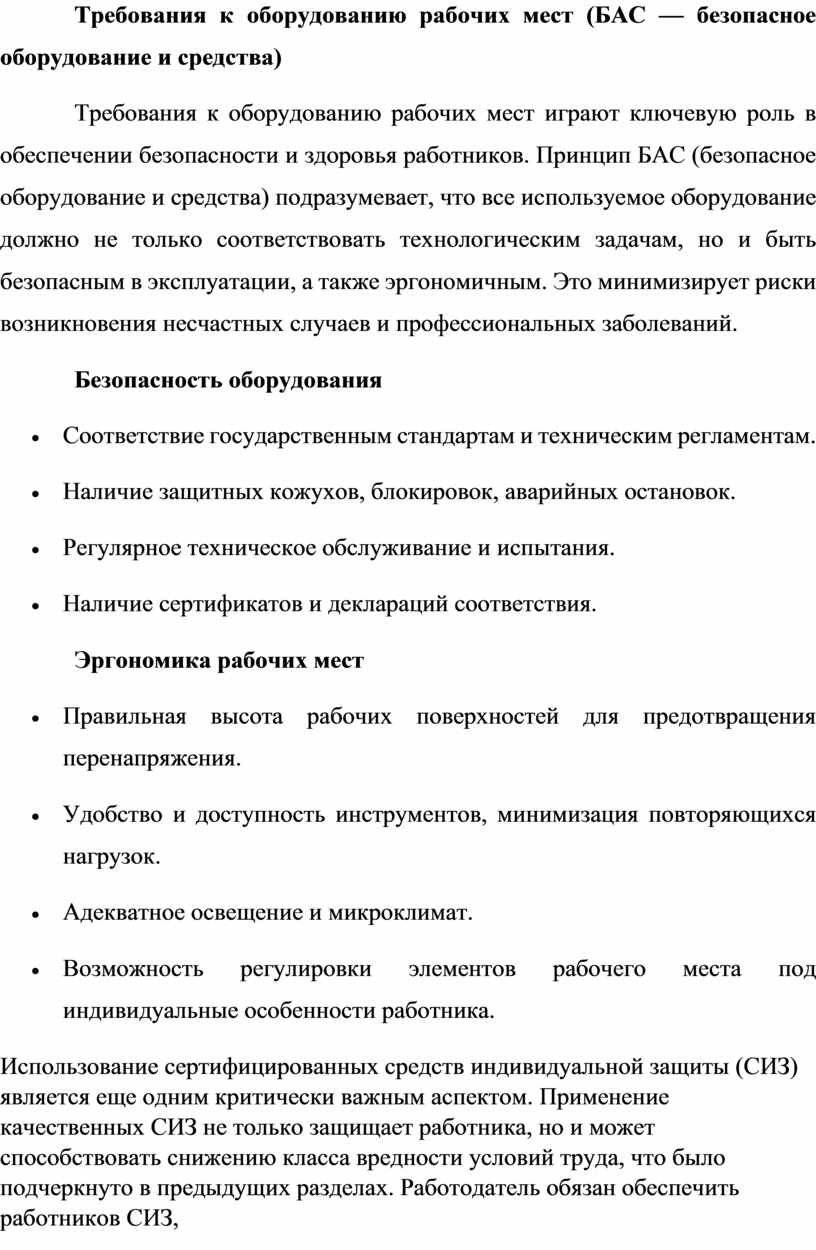 Требования к оборудованию рабочих мест играют ключевую роль в обеспечении безопасности и здоровья работников. Принцип БАС (безопасное оборудование и средства) подразумевает, что все используемое оборудование должно не только соответствовать технологическим задачам, но и быть безопасным в эксплуатации, а также эргономичным. Это минимизирует риски возникновения несчастных случаев и профессиональных заболеваний.