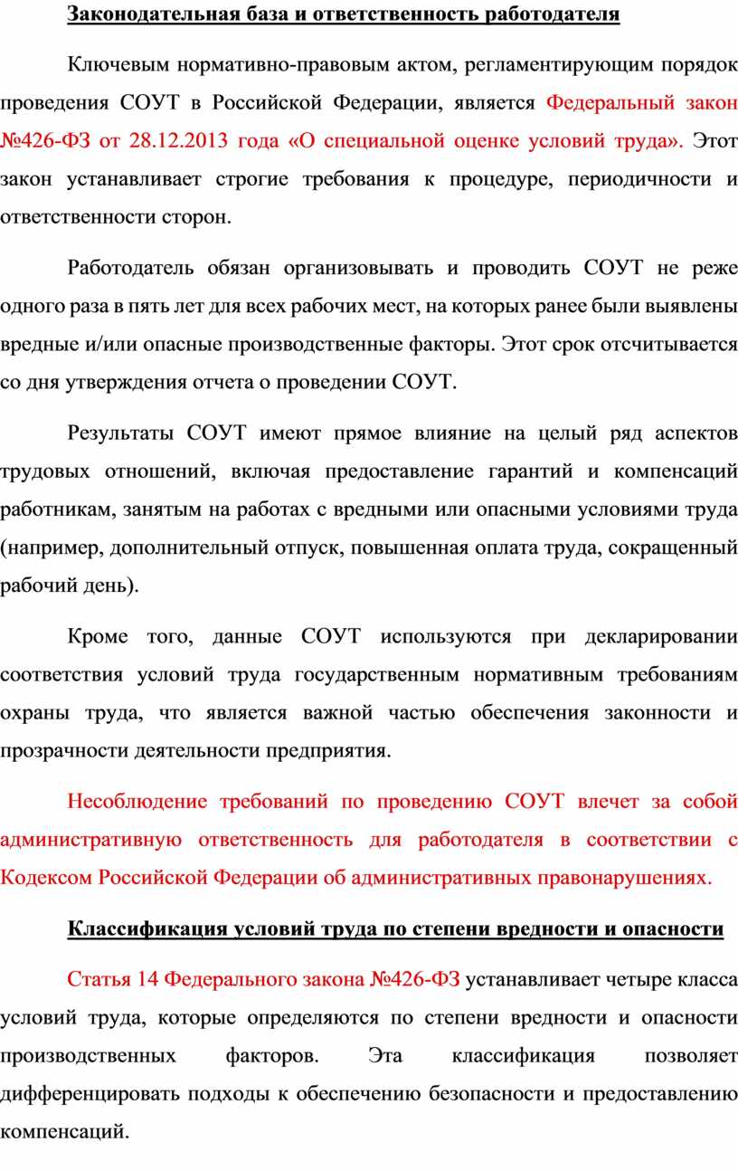 Ключевым нормативно-правовым актом, регламентирующим порядок проведения СОУТ в Российской Федерации, является Федеральный закон №426-ФЗ от 28.12.2013 года «О специальной оценке условий труда». Этот закон устанавливает строгие требования к процедуре, периодичности и ответственности сторон.