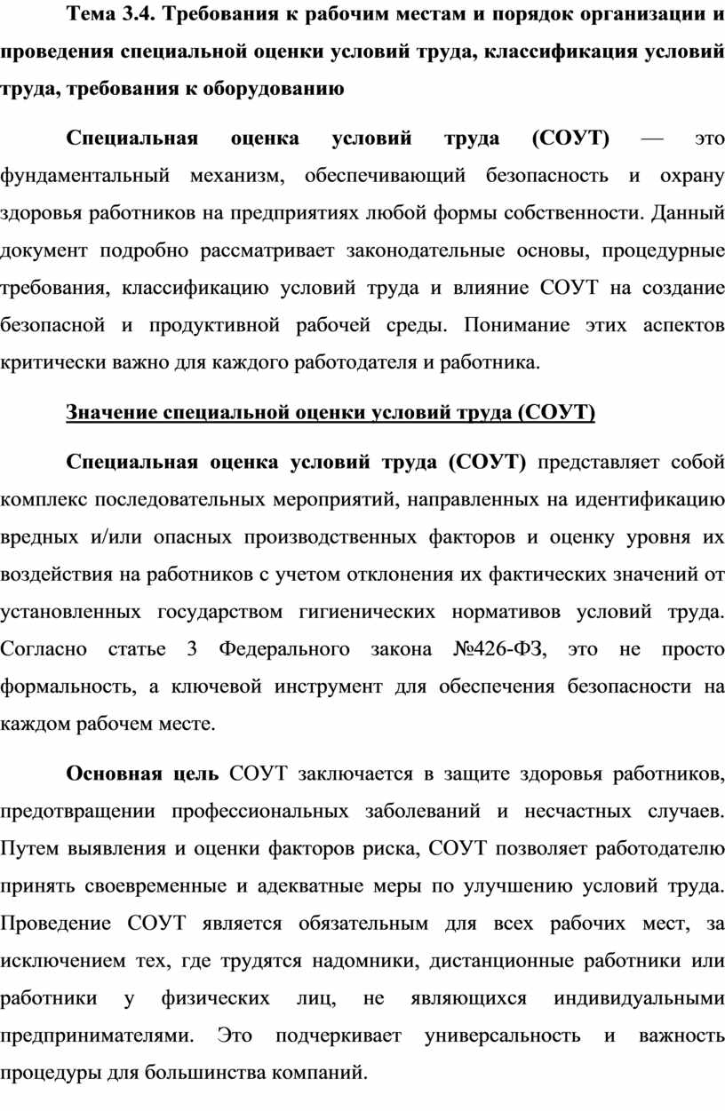 Тема 3.4. Требования к рабочим местам и порядок организации и проведения специальной оценки условий труда, классификация условий труда, требования к оборудованию