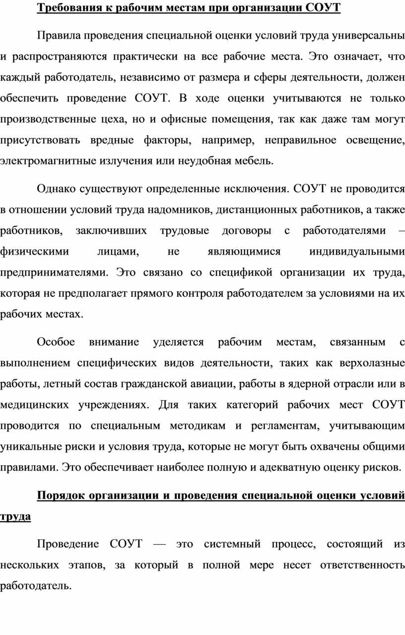 Однако существуют определенные исключения. СОУТ не проводится в отношении условий труда надомников, дистанционных работников, а также работников, заключивших трудовые договоры с работодателями – физическими лицами, не являющимися индивидуальными предпринимателями. Это связано со спецификой организации их труда, которая не предполагает прямого контроля работодателем за условиями на их рабочих местах.