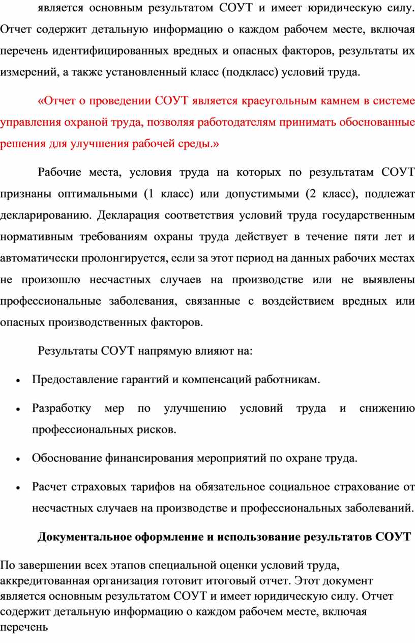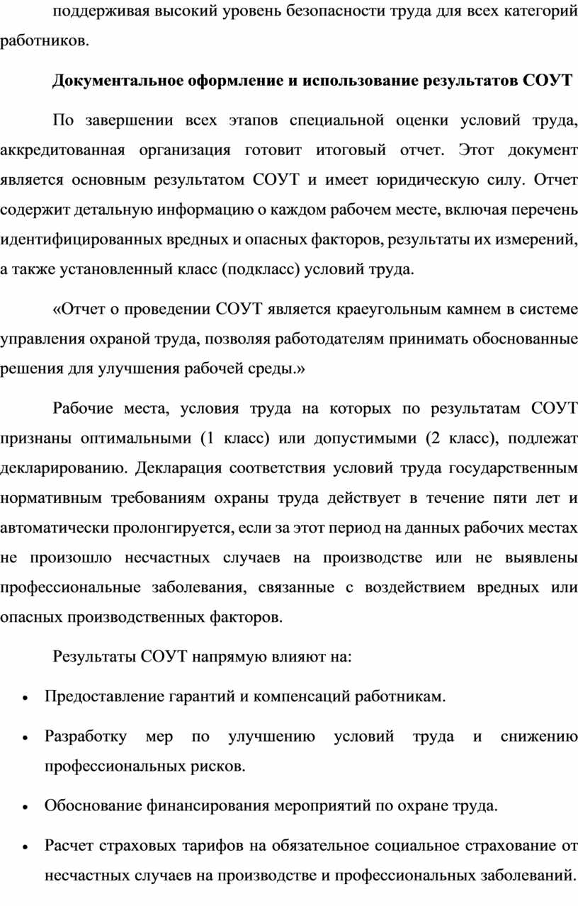 Результаты СОУТ имеют прямое влияние на целый ряд аспектов трудовых отношений, включая предоставление гарантий и компенсаций работникам, занятым на работах с вредными или опасными условиями труда (например, дополнительный отпуск, повышенная оплата труда, сокращенный рабочий день).