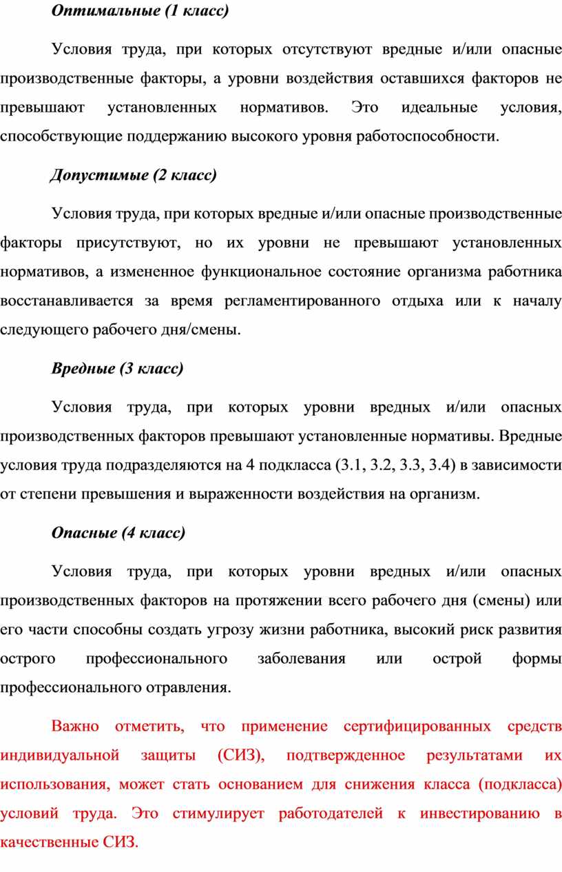 Важно отметить, что применение сертифицированных средств индивидуальной защиты (СИЗ), подтвержденное результатами их использования, может стать основанием для снижения класса (подкласса) условий труда. Это стимулирует работодателей к инвестированию в качественные СИЗ.