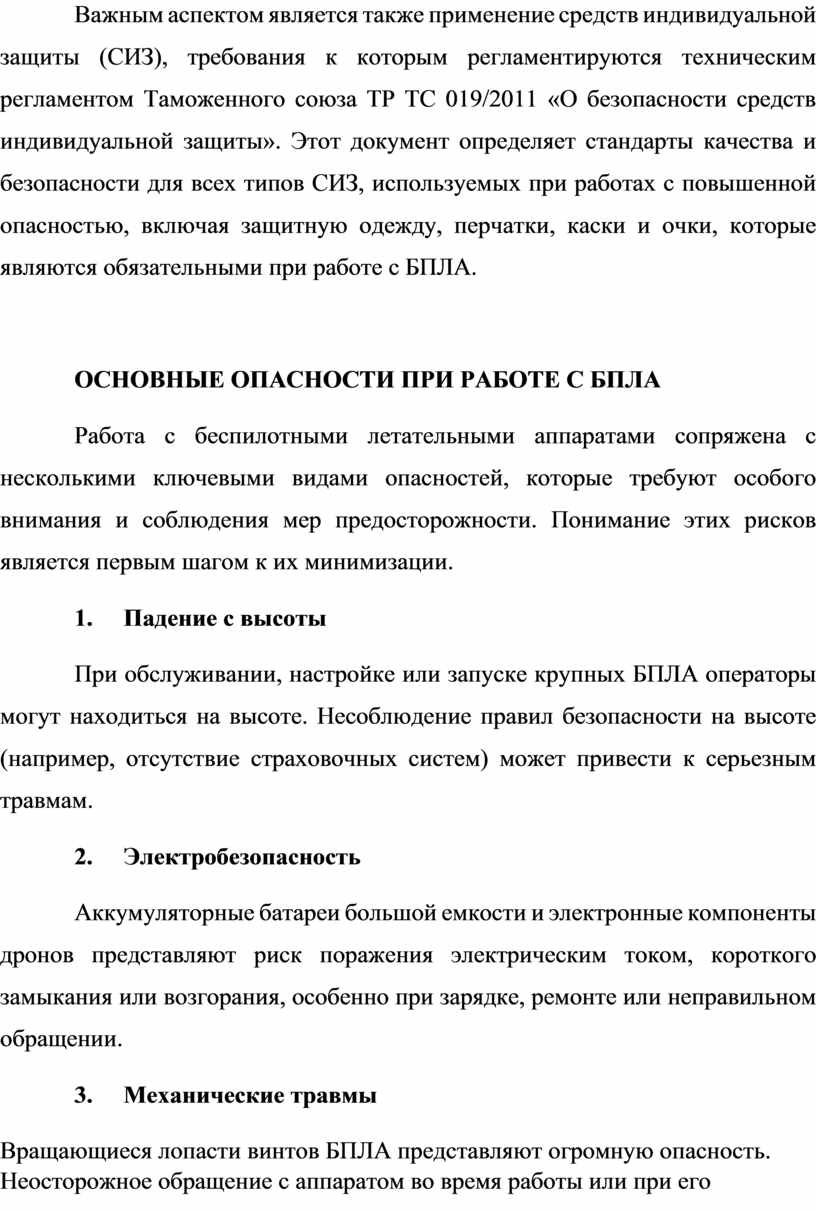 Важным аспектом является также применение средств индивидуальной защиты (СИЗ), требования к которым регламентируются техническим регламентом Таможенного союза ТР ТС 019/2011 «О безопасности средств индивидуальной защиты». Этот документ определяет стандарты качества и безопасности для всех типов СИЗ, используемых при работах с повышенной опасностью, включая защитную одежду, перчатки, каски и очки, которые являются обязательными при работе с БПЛА.
