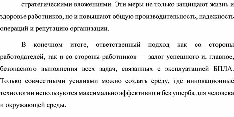 В конечном итоге, ответственный подход как со стороны работодателей, так и со стороны работников — залог успешного и, главное, безопасного выполнения всех задач, связанных с эксплуатацией БПЛА. Только совместными усилиями можно создать среду, где инновационные технологии используются максимально эффективно и без ущерба для человека и окружающей среды.