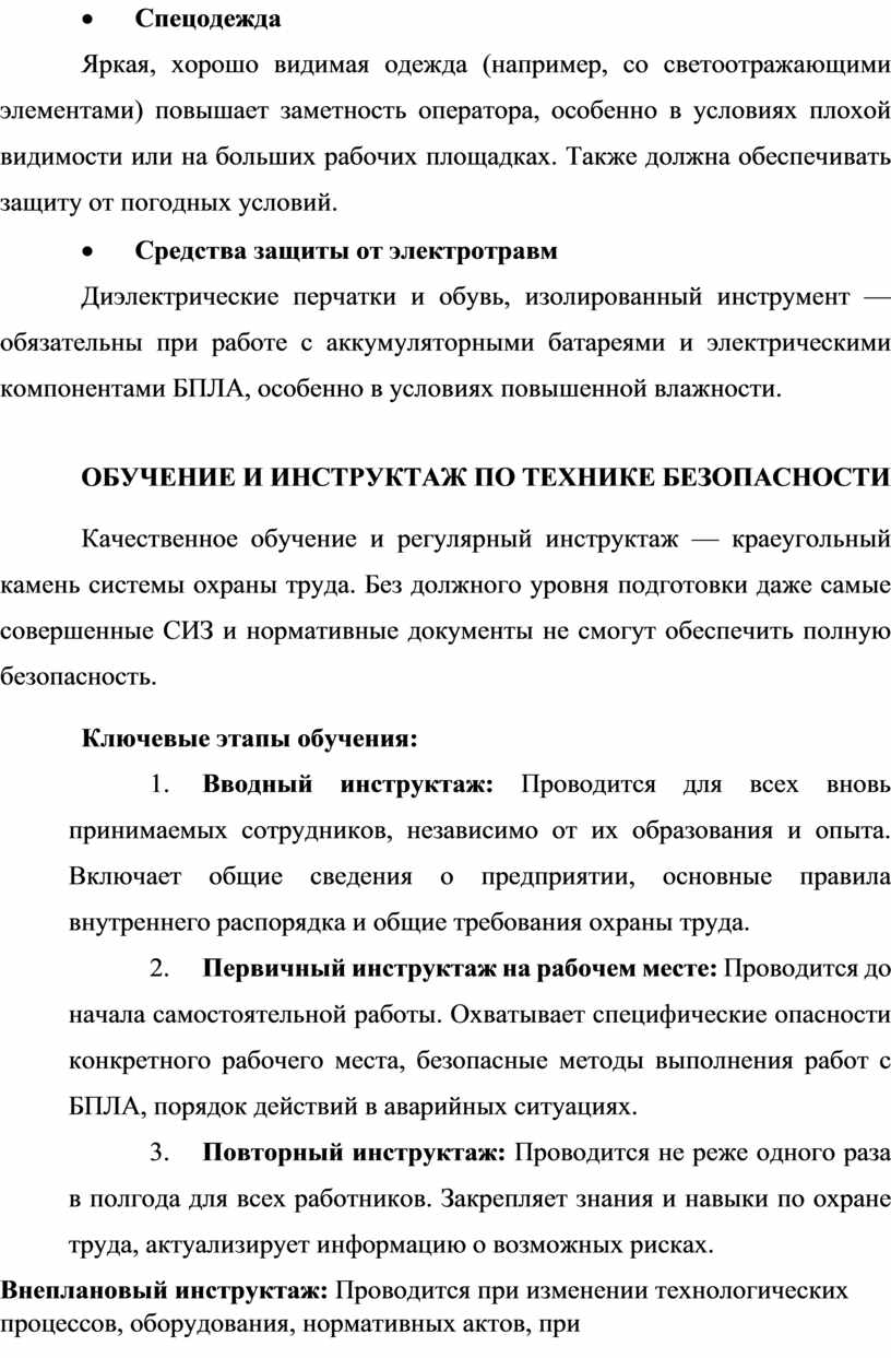 2. Первичный инструктаж на рабочем месте: Проводится до начала самостоятельной работы. Охватывает специфические опасности конкретного рабочего места, безопасные методы выполнения работ с БПЛА, порядок действий в аварийных ситуациях.