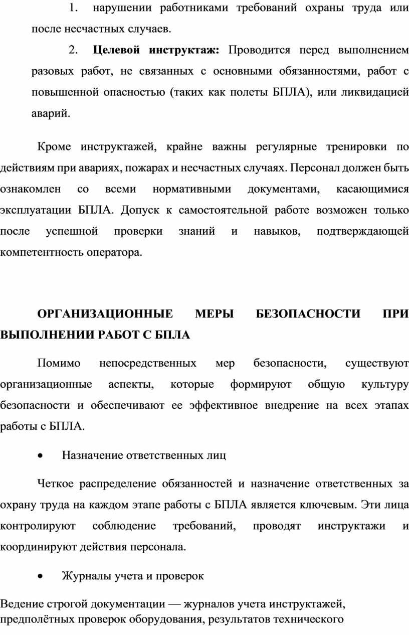 5. Целевой инструктаж: Проводится перед выполнением разовых работ, не связанных с основными обязанностями, работ с повышенной опасностью (таких как полеты БПЛА), или ликвидацией аварий.