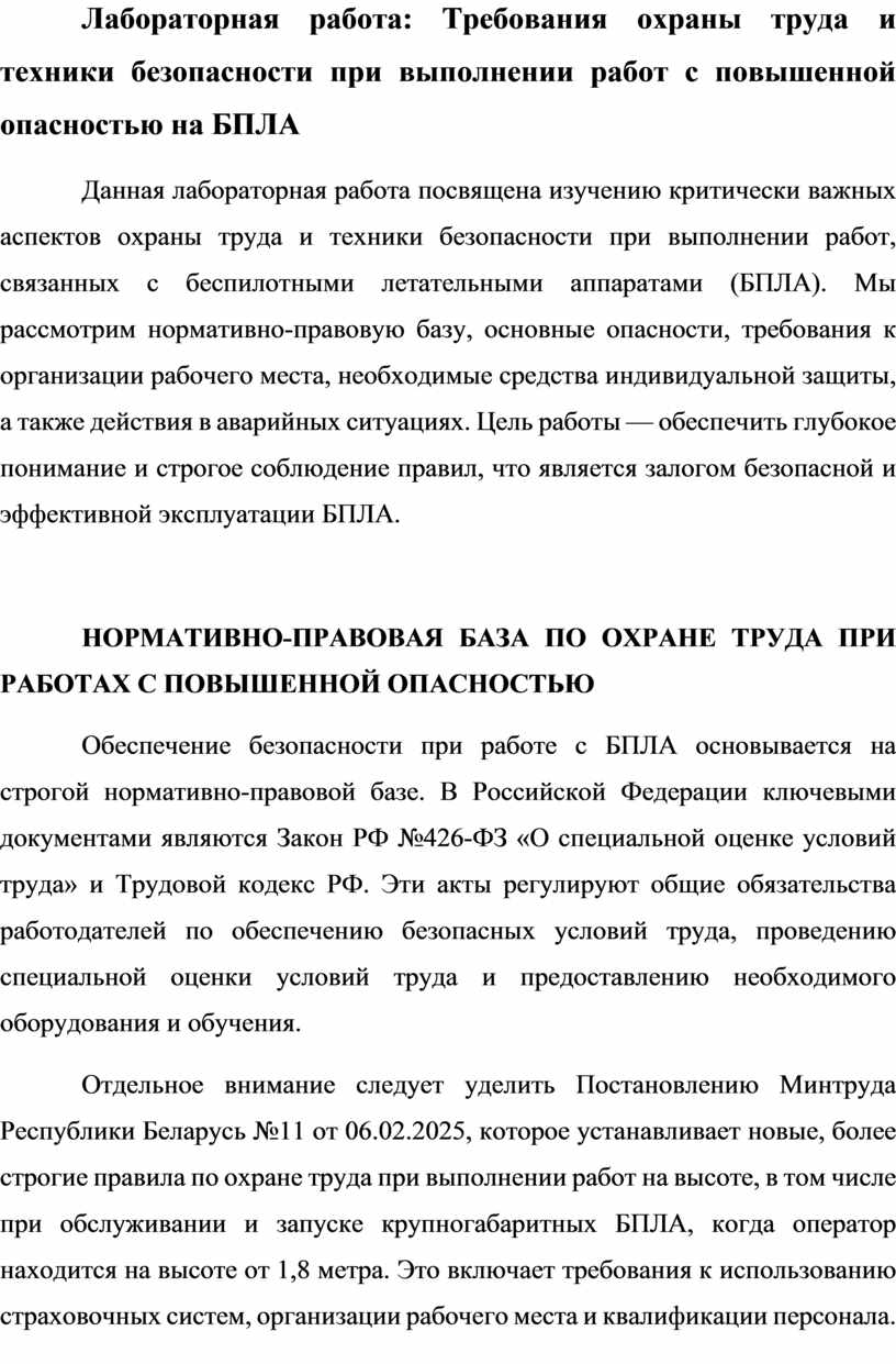 Данная лабораторная работа посвящена изучению критически важных аспектов охраны труда и техники безопасности при выполнении работ, связанных с беспилотными летательными аппаратами (БПЛА). Мы рассмотрим нормативно-правовую базу, основные опасности, требования к организации рабочего места, необходимые средства индивидуальной защиты, а также действия в аварийных ситуациях. Цель работы — обеспечить глубокое понимание и строгое соблюдение правил, что является залогом безопасной и эффективной эксплуатации БПЛА.