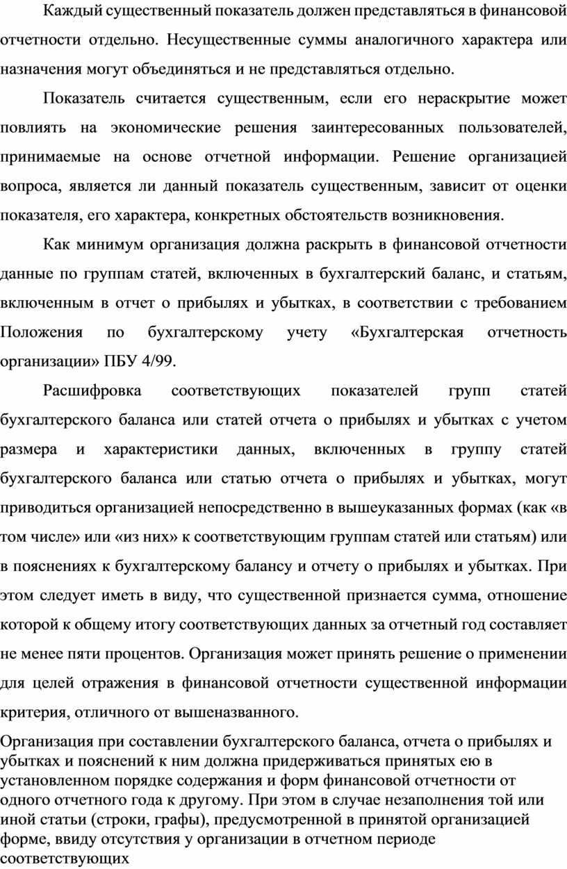 Расшифровка соответствующих показателей групп статей бухгалтерского баланса или статей отчета о прибылях и убытках с учетом размера и характеристики данных, включенных в группу статей бухгалтерского баланса или статью отчета о прибылях и убытках, могут приводиться организацией непосредственно в вышеуказанных формах (как «в том числе» или «из них» к соответствующим группам статей или статьям) или в пояснениях к бухгалтерскому балансу и отчету о прибылях и убытках. При этом следует иметь в виду, что существенной признается сумма, отношение которой к общему итогу соответствующих данных за отчетный год составляет не менее пяти процентов. Организация может принять решение о применении для целей отражения в финансовой отчетности существенной информации критерия, отличного от вышеназванного.