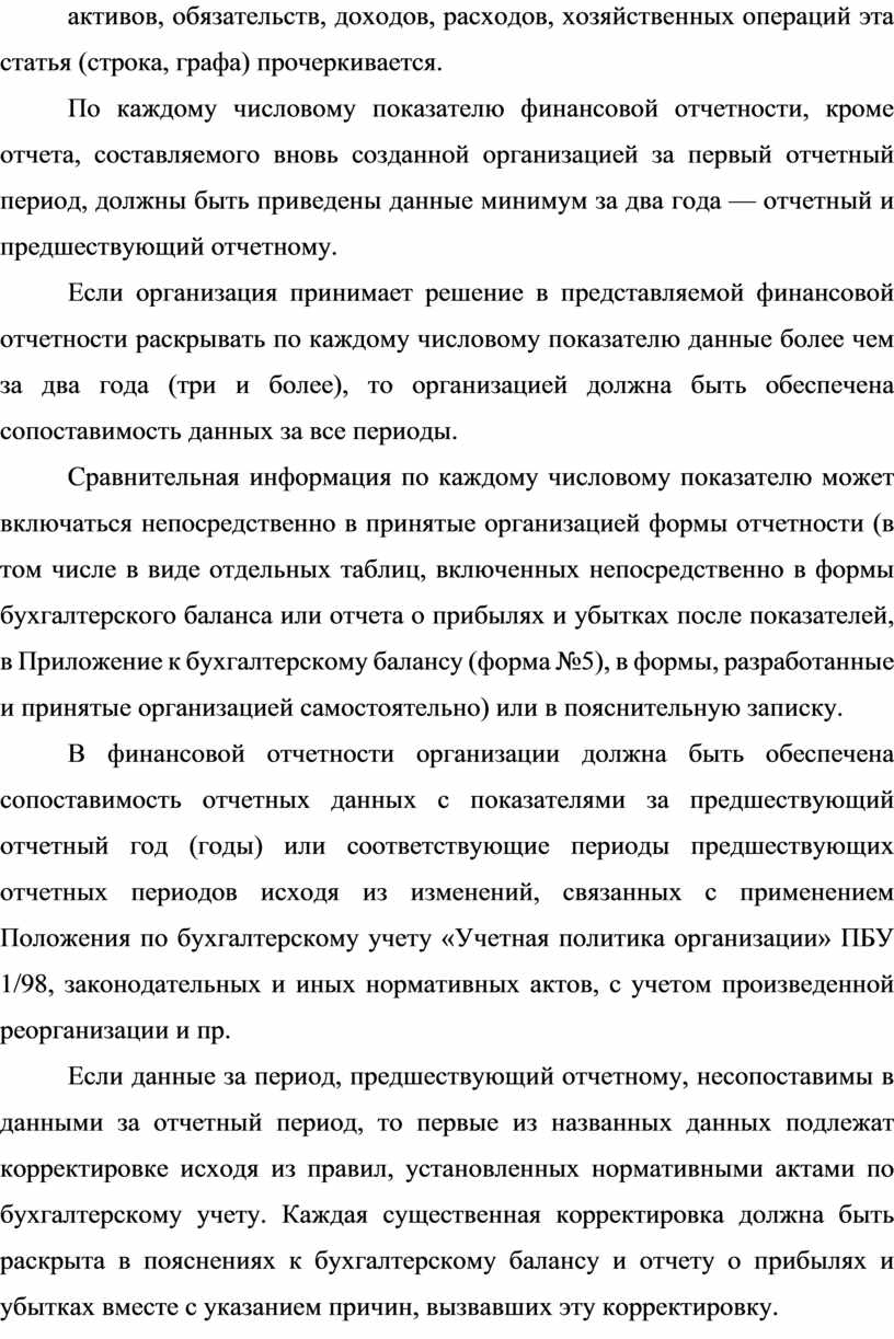 В финансовой отчетности организации должна быть обеспечена сопоставимость отчетных данных с показателями за предшествующий отчетный год (годы) или соответствующие периоды предшествующих отчетных периодов исходя из изменений, связанных с применением Положения по бухгалтерскому учету «Учетная политика организации» ПБУ 1/98, законодательных и иных нормативных актов, с учетом произведенной реорганизации и пр.