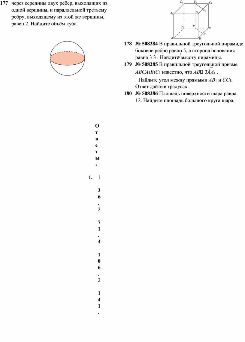 204 № 324459 Объём треугольной призмы, отсекаемой от куба плоскостью, проходящей через середины двух рёбер, выходящих из одной вершины, и параллельной третьему ребру, выходящему из этой же вершины, равен 2. Найдите объём куба.