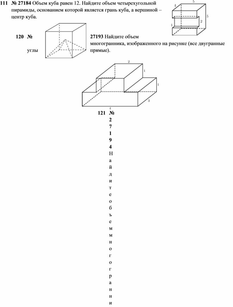 15 № 27044 Найдите объем многогранника, изображенного на рисунке (все двугранные углы многогранника прямые).