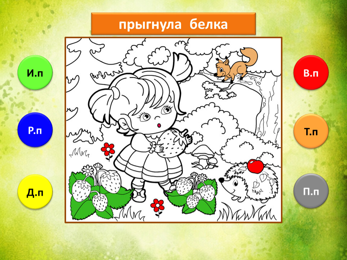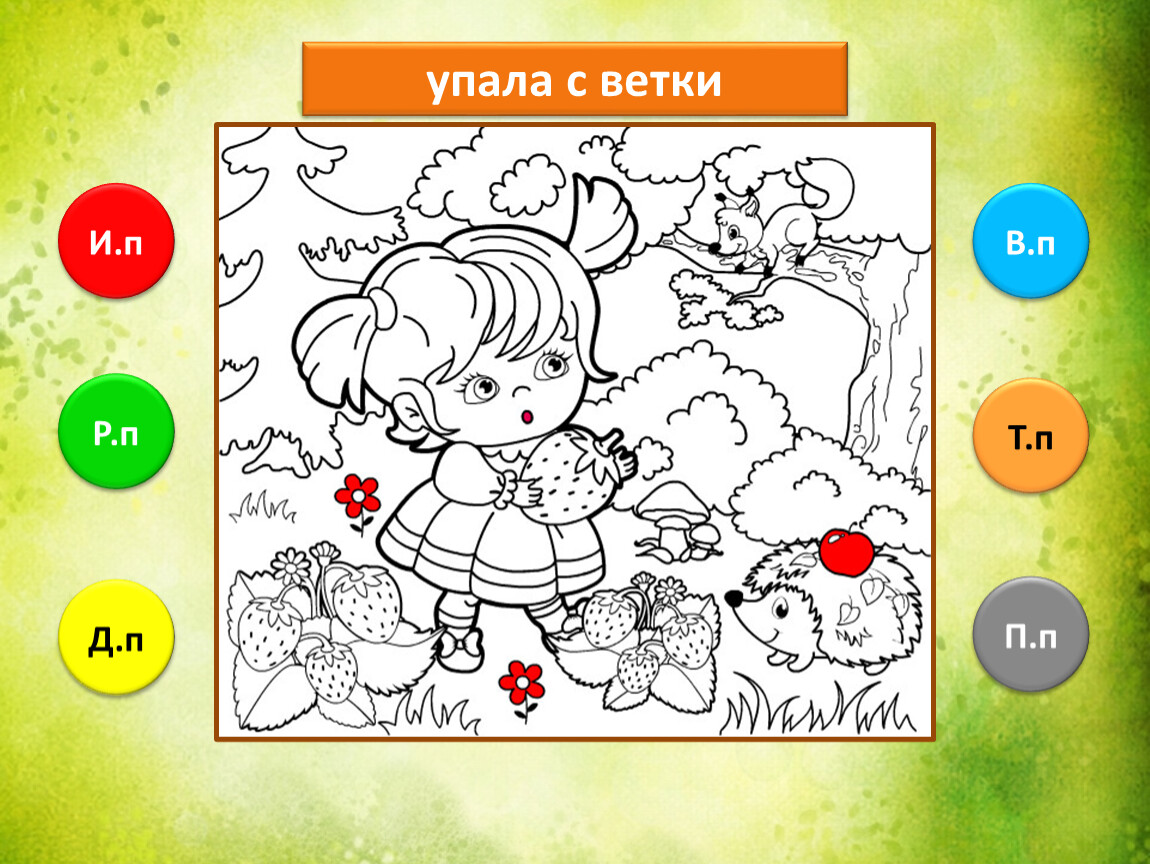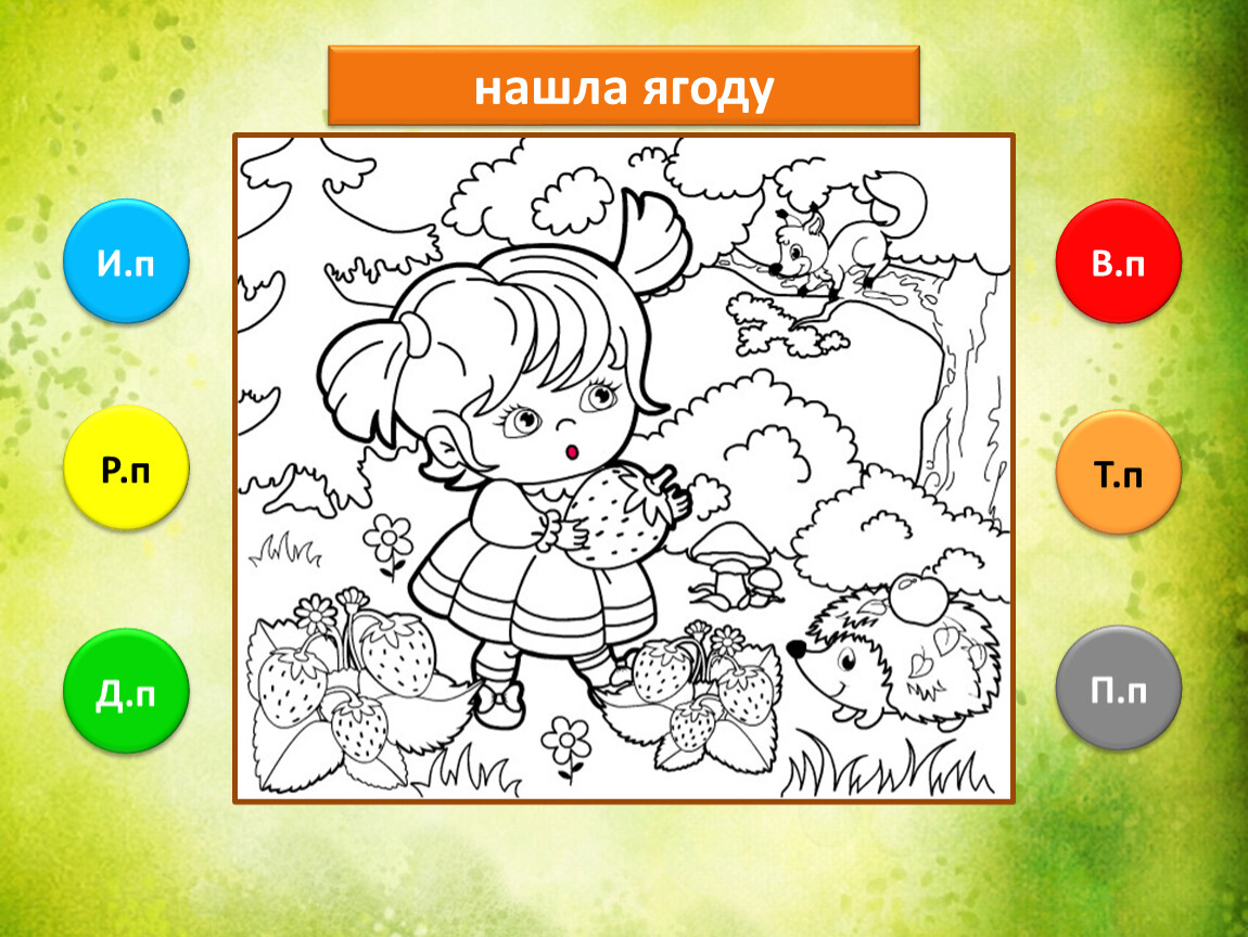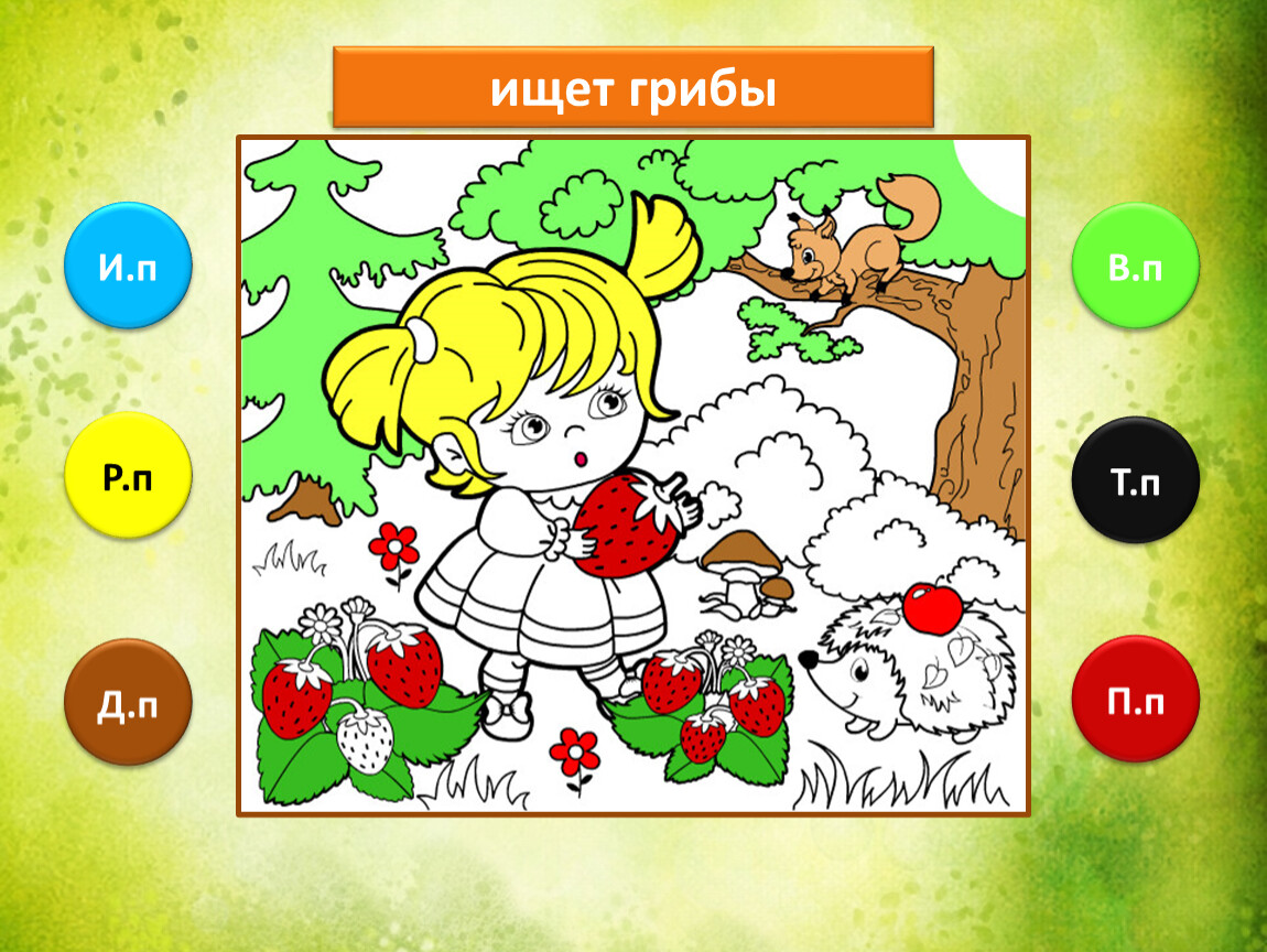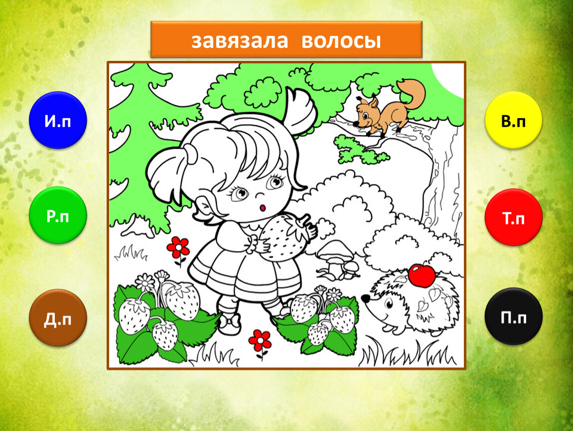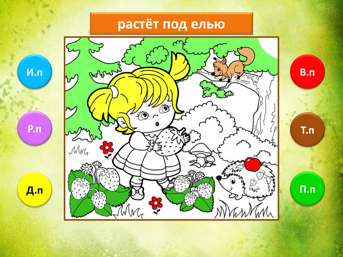 Предлагаю тебе проверить, как ты умеешь определять падежи имени существительного. Тебе предстоит закончить рисунок, раскрасив его в подходящие цвета. Если не торопиться и хорошо подобрать цвета, то получится замечательная лесная полянка.