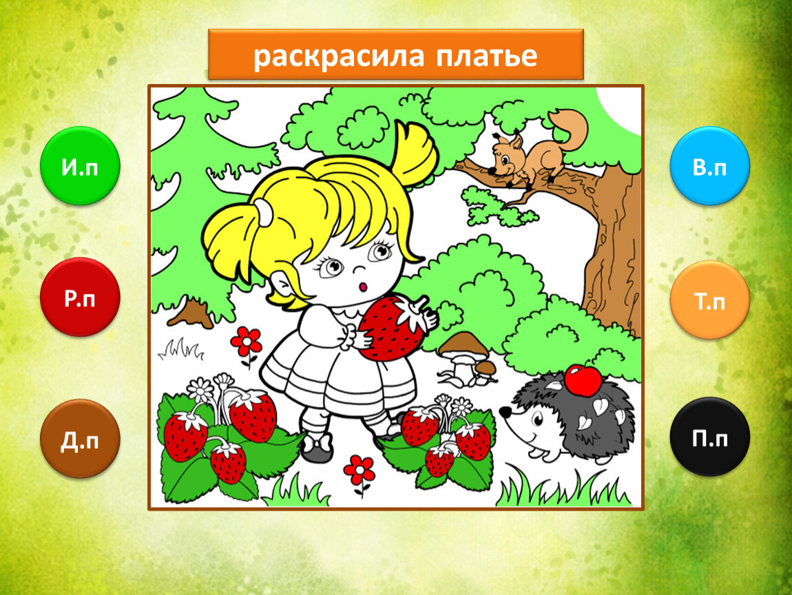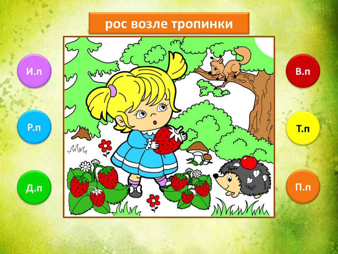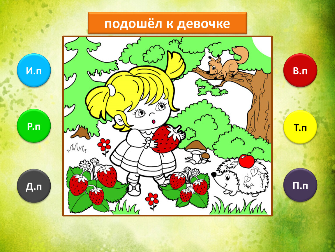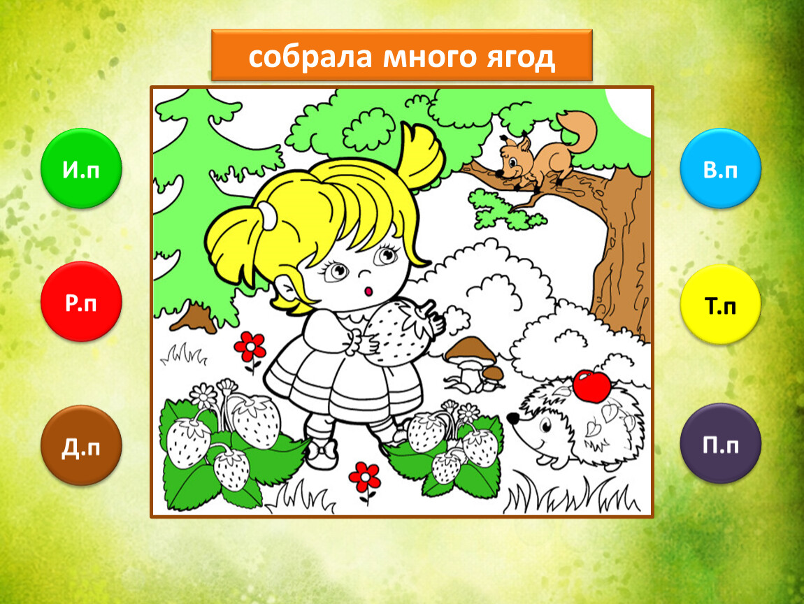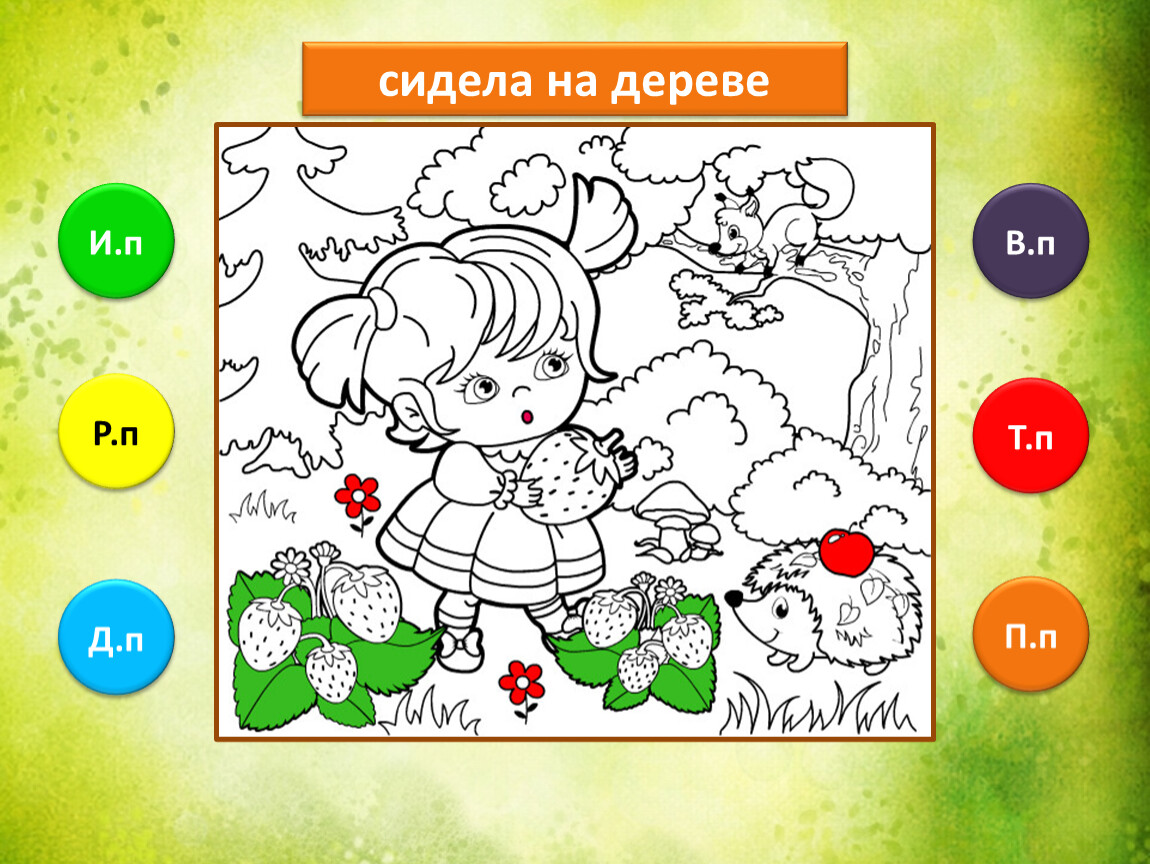 Предлагаю тебе проверить, как ты умеешь определять падежи имени существительного. Тебе предстоит закончить рисунок, раскрасив его в подходящие цвета. Если не торопиться и хорошо подобрать цвета, то получится замечательная лесная полянка.