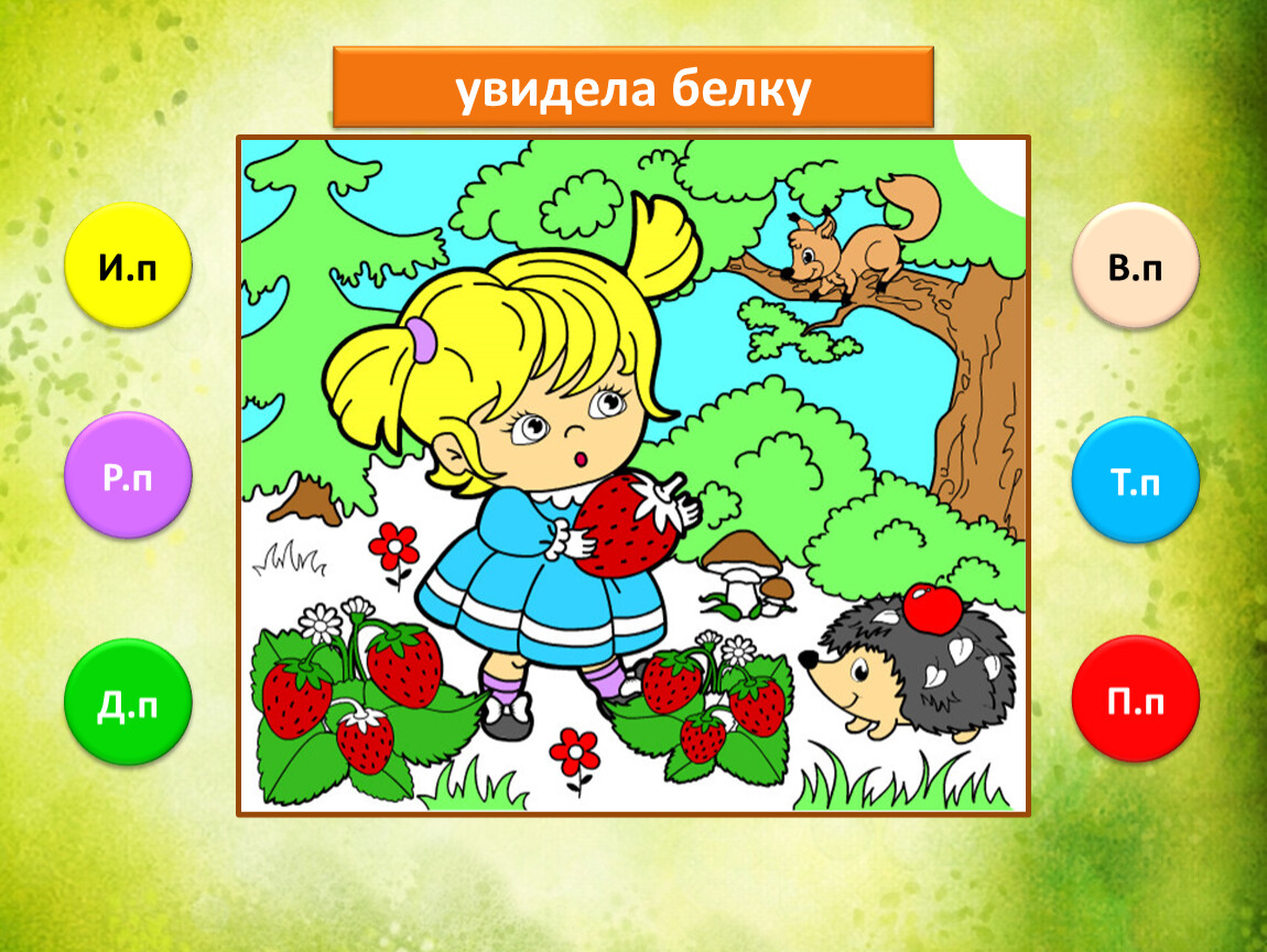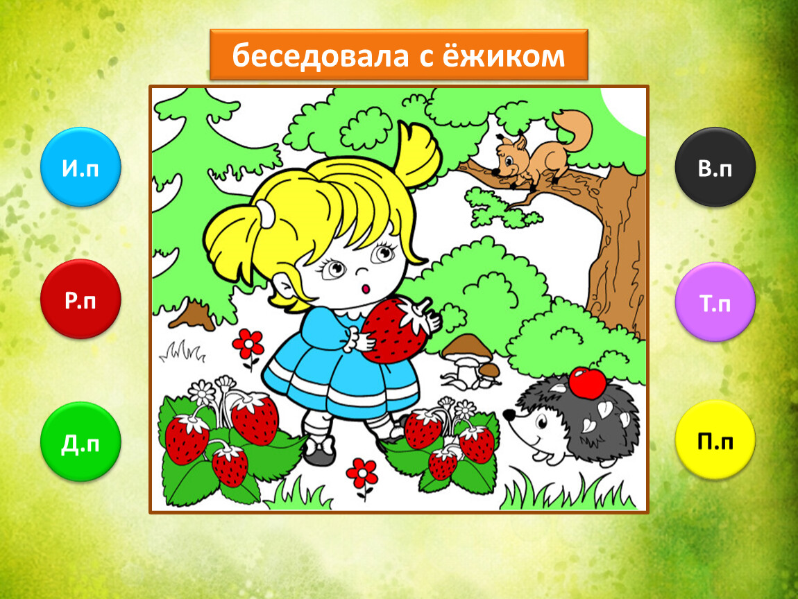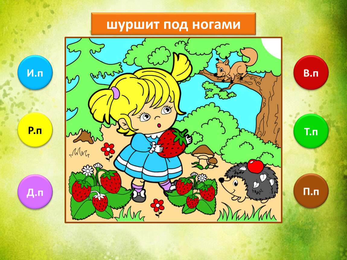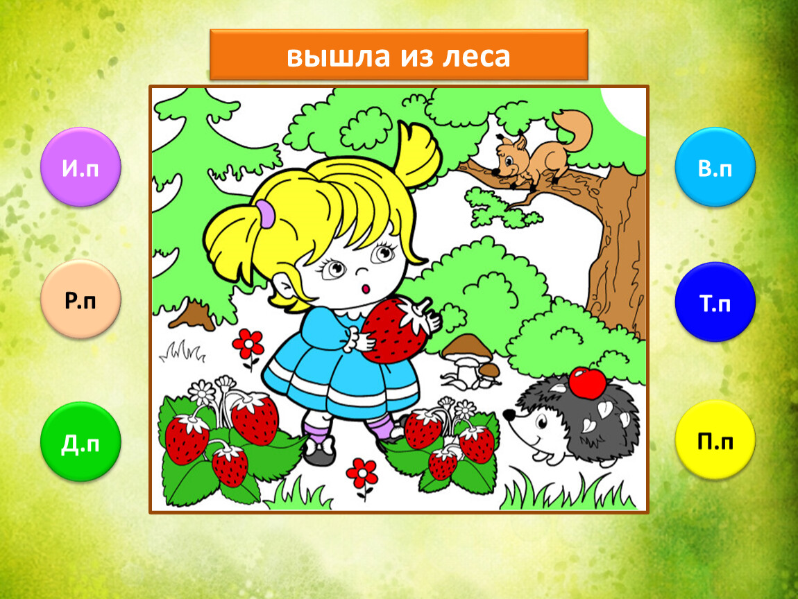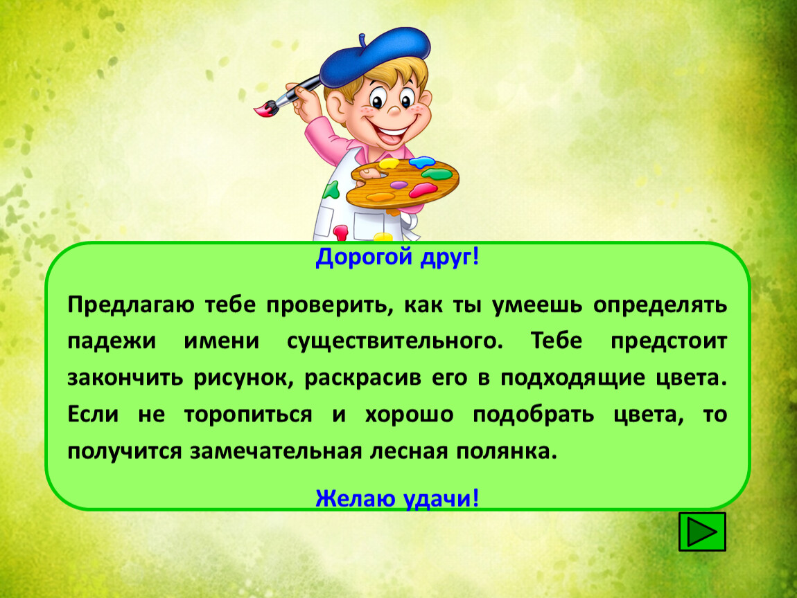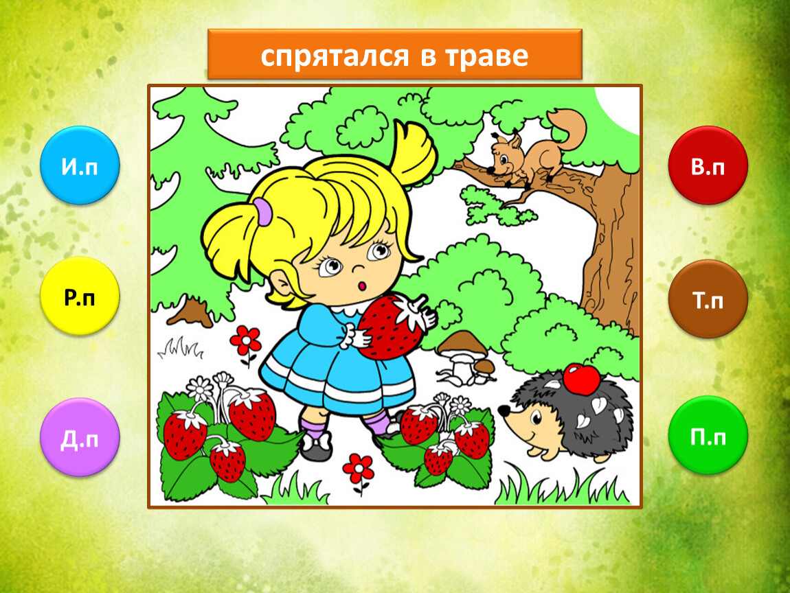 Предлагаю тебе проверить, как ты умеешь определять падежи имени существительного. Тебе предстоит закончить рисунок, раскрасив его в подходящие цвета. Если не торопиться и хорошо подобрать цвета, то получится замечательная лесная полянка.