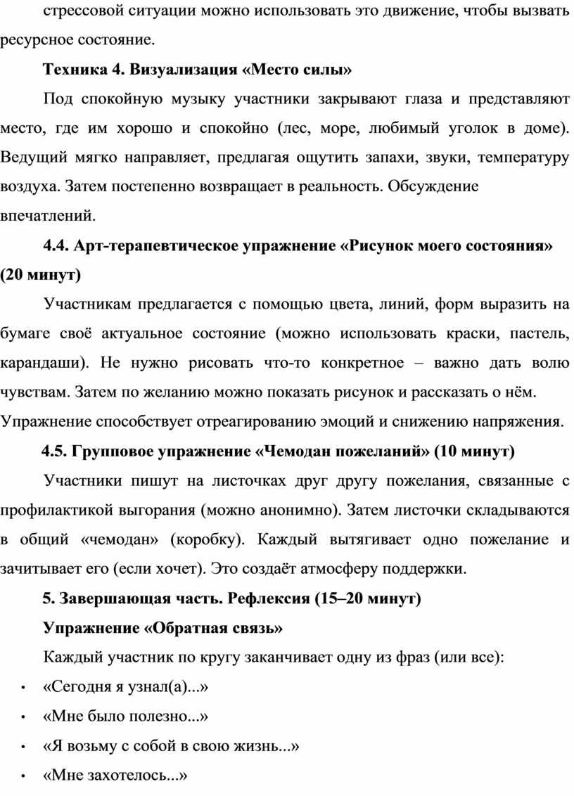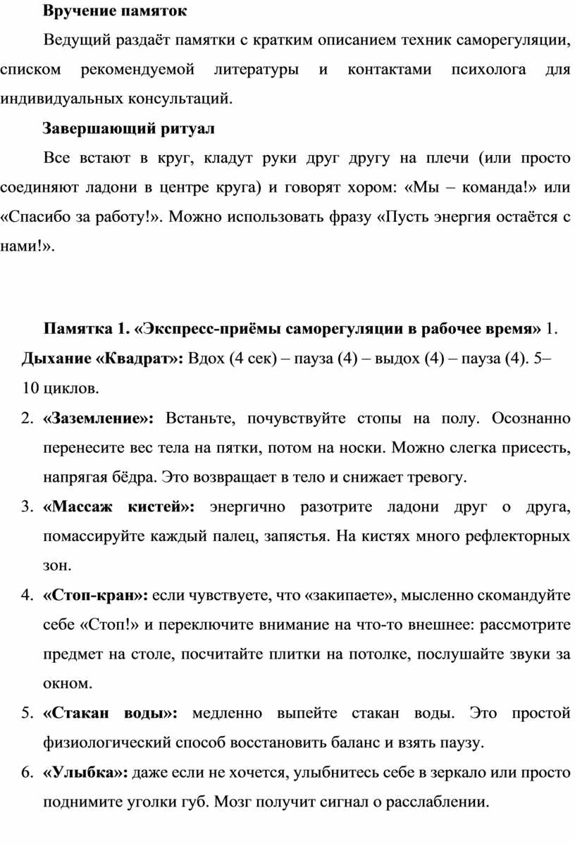 Ведущий раздаёт памятки с кратким описанием техник саморегуляции, списком рекомендуемой литературы и контактами психолога для индивидуальных консультаций.